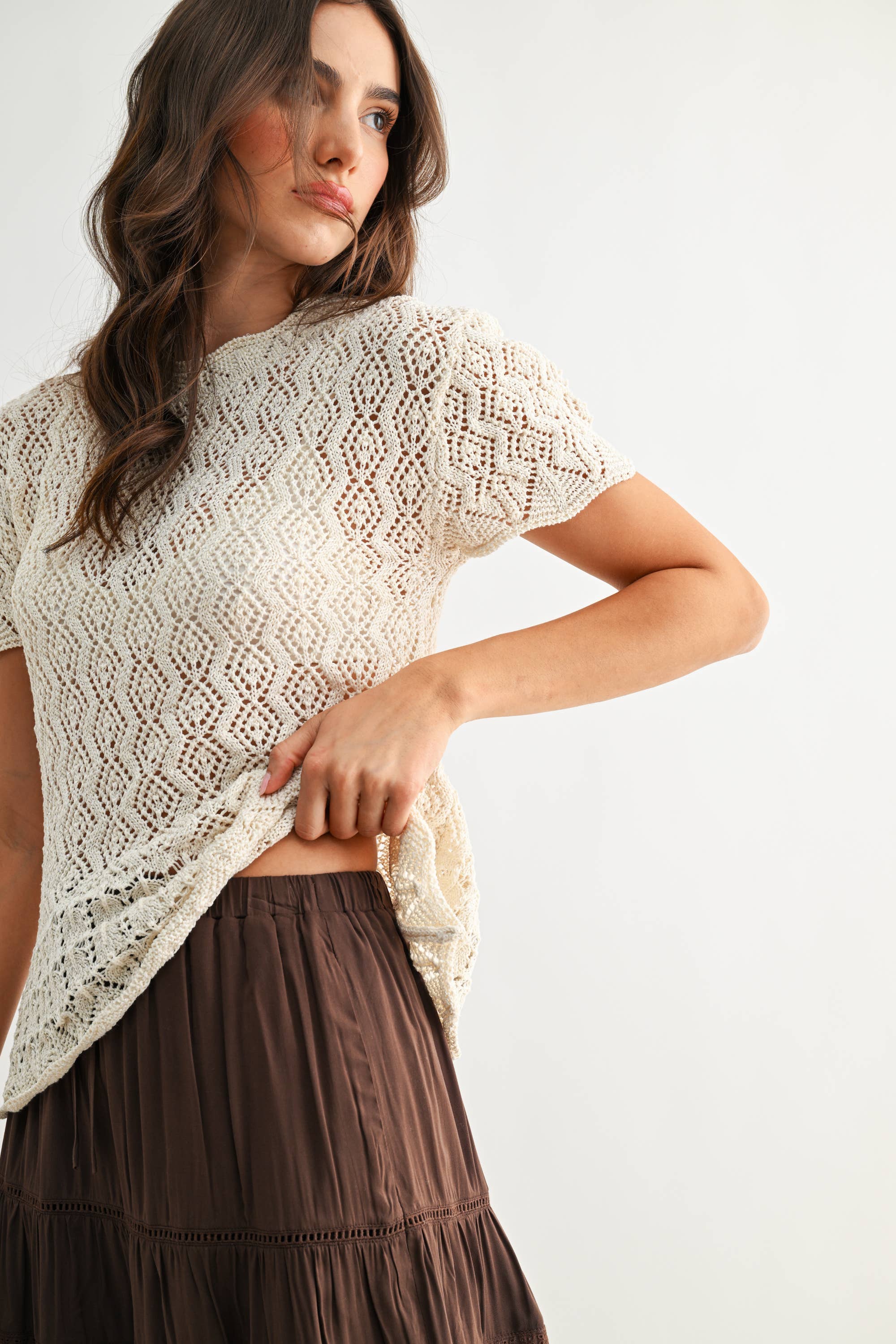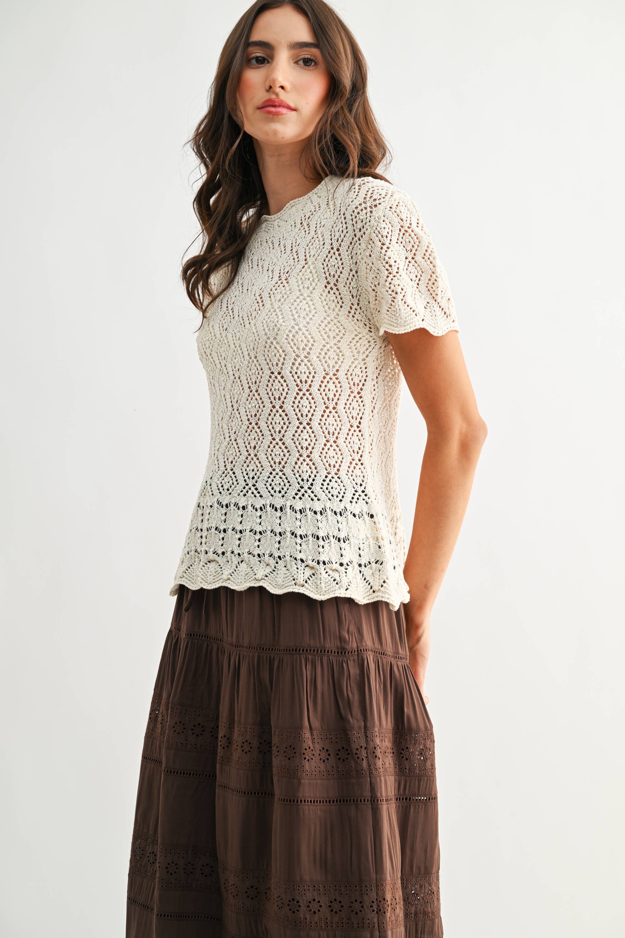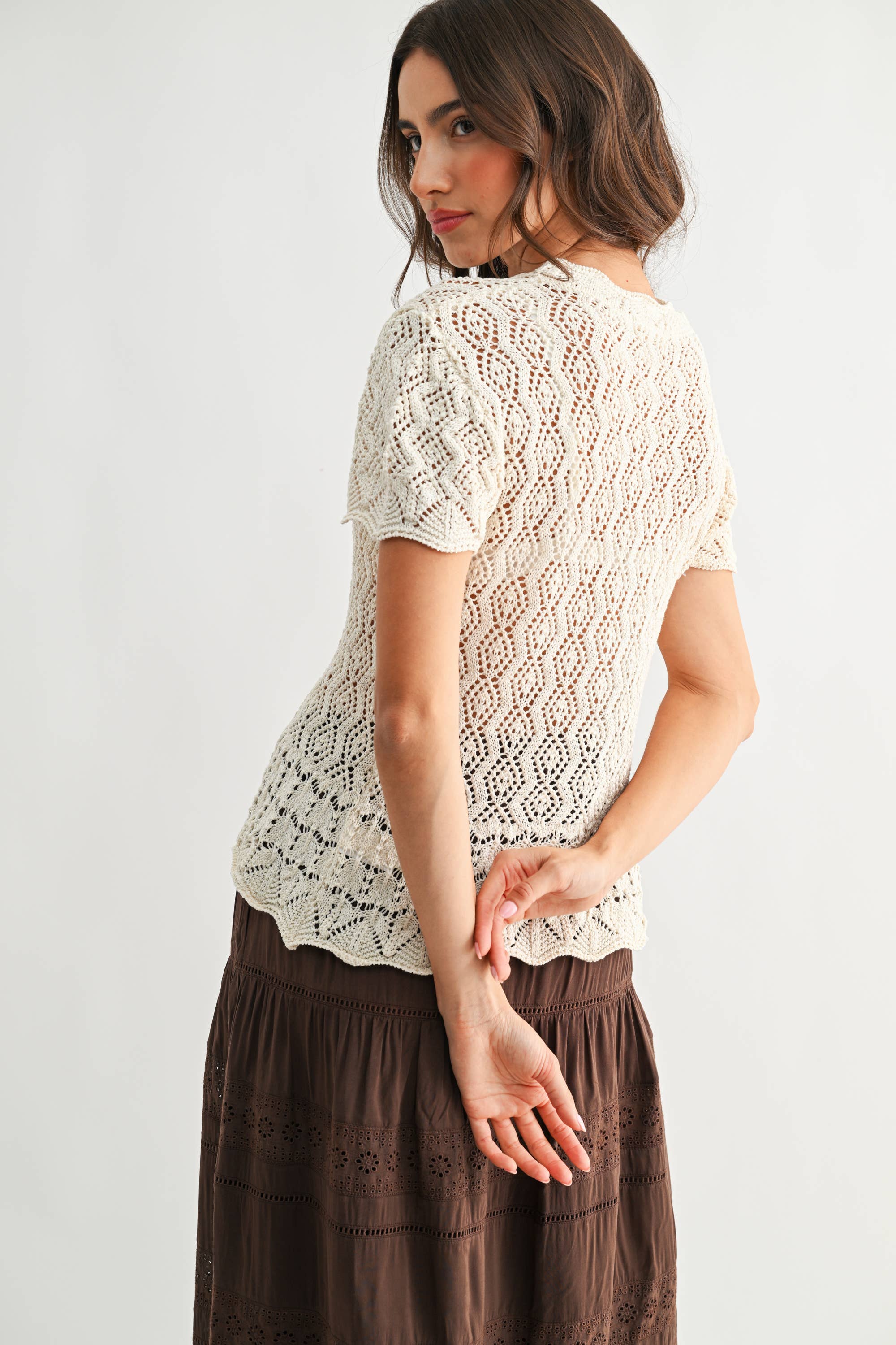 Discover the perfect balance of contemporary style and classic craftsmanship with this Elegant Lace Short Sleeve Knit Top in Ivory. Carefully constructed from premium yarns, the intricate openwork pattern delivers both visual interest and a light, breathable feel, making it ideal for sophisticated office attire or upscale business-casual events. SELF: 80% POLYESTER 20% COTTON Model is wearing a size S Model : 5'9" - B 32" - W 24" - H 36.5"