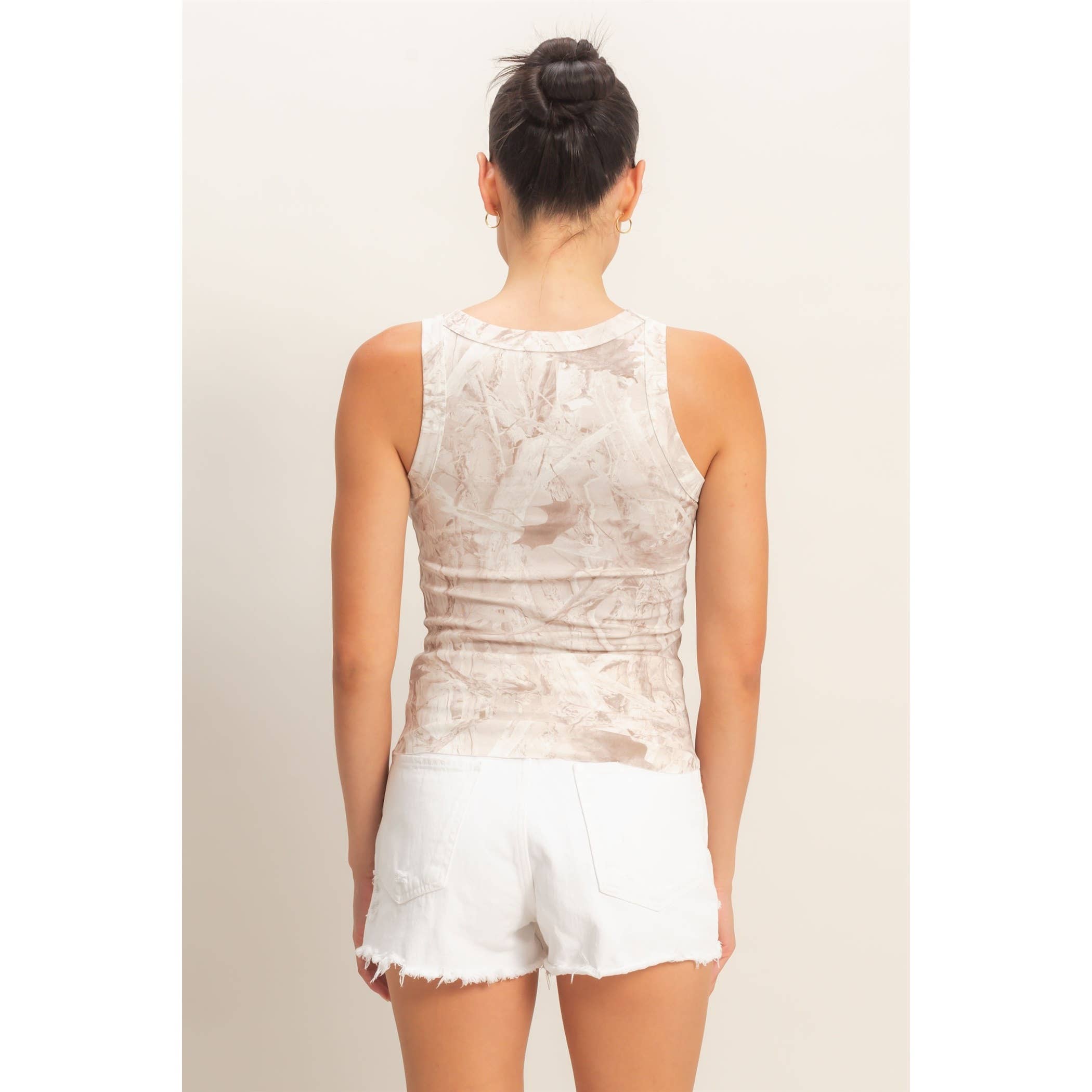 This slim fit ribbed knit tank features a classic crew neckline and a cloud wash pattern. Its clean lines and sleeveless design create a sleek silhouette, ideal for layering or standalone wear. Pair it with distressed denim shorts and sneakers for a fresh, casual ensemble. Model Is 5' 8" Tall, 32" Chest, 25" Waist, 35" Hips And Wearing A Size Small Imported. Designed In The USA