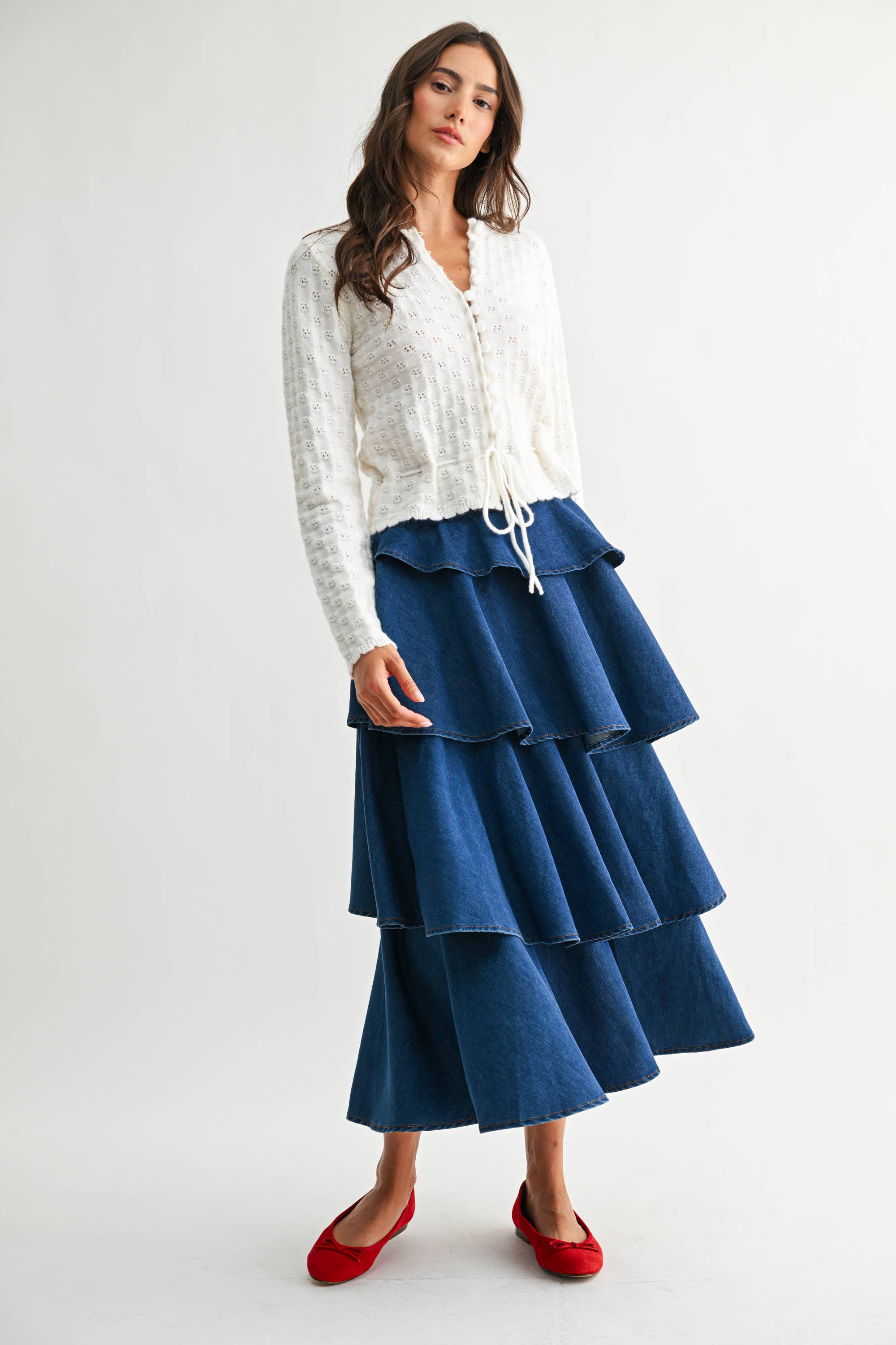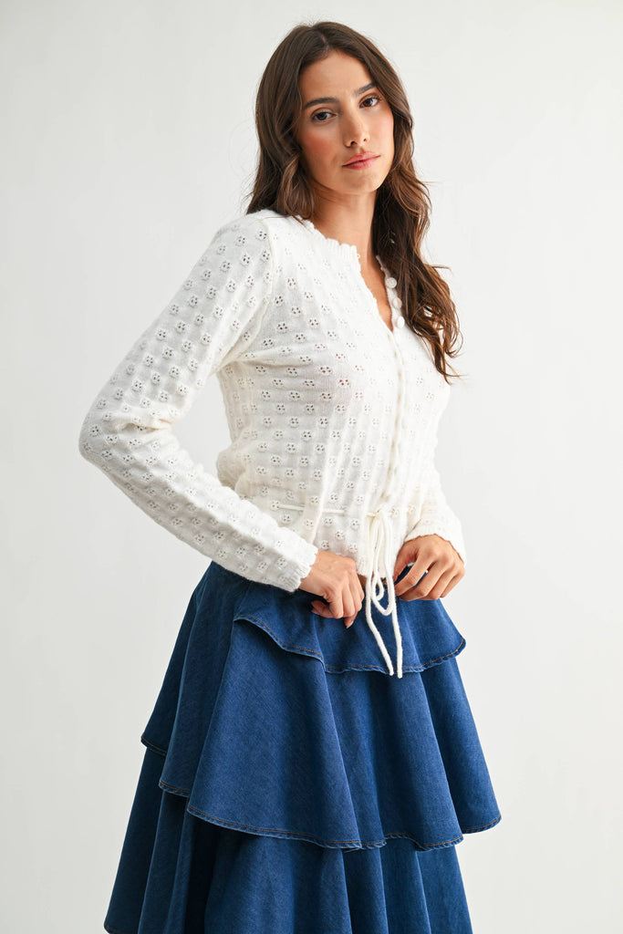 The Snowdrop Button-Down Cardigan is a charming and feminine layer crafted in a delicate knit with subtle textured detailing. Featuring a full front of fabric-covered buttons and a drawstring waist for a flattering fit, this soft white cardigan adds a touch of romance to any outfit. Perfect for pairing with skirts, dresses, or jeans, it’s a versatile piece for both casual and dressy occasions. SELF: 42% ACRYLIC, 30% POLYESTER, 28% NYLON Model is wearing a size S Model : 5'9" - B 32" - W 24" - H 36.5"