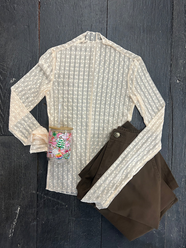 Semi-Sheer Fabric: Lightweight and breathable material with a textured pattern. - High Neckline: Subtle ruffle edge adds a refined touch. - Fitted Long Sleeves: Elegant and snug for a sleek look. - Stretchy Fit: Comfortable and flexible for all-day wear. - Versatile Layering Piece: Perfect to wear over camisoles or bralettes. - Minimalist Chic: Simple yet stylish, ideal for layering in any season. A delicate and sophisticated sheer top, perfect for layering and elevating any outfit with its elegant texture.