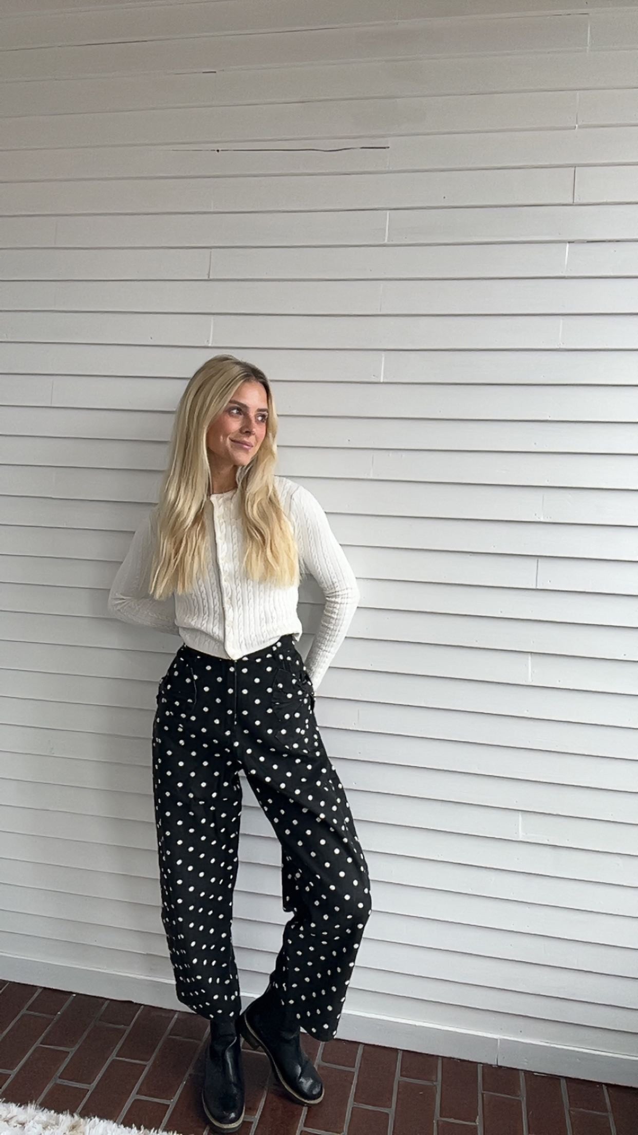 Elevate your denim collection with these high-rise printed pants, designed for effortless sophistication. The allover polka dot pattern adds playful visual interest, while charming bow-tied side panels create a refined silhouette. Cut with a relaxed tapered leg for comfortable movement without sacrificing style. Crafted from a durable cotton-polyester blend, these versatile pants transition seamlessly from casual outings to elevated everyday wear. A timeless piece that bridges classic and contemporary aesthetics.
