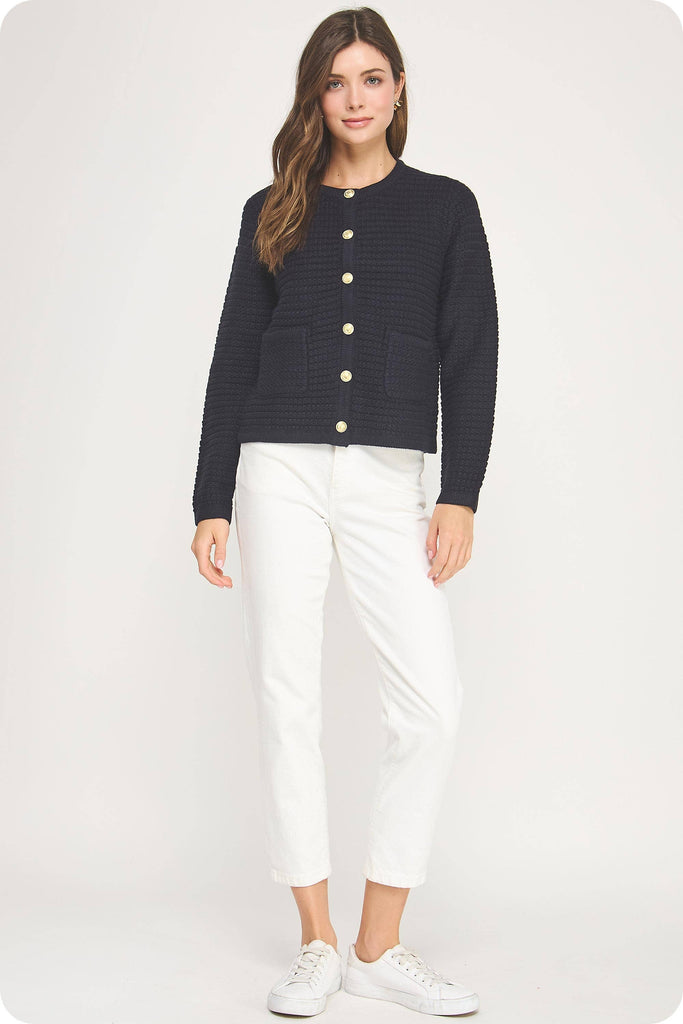 Studio Strut and Bolt Collection. Button down cardigan jacket sweater in texture knit fabric. This chic versatile knitted style features gold button closure at front, front pockets, round neckline, and long sleeves.