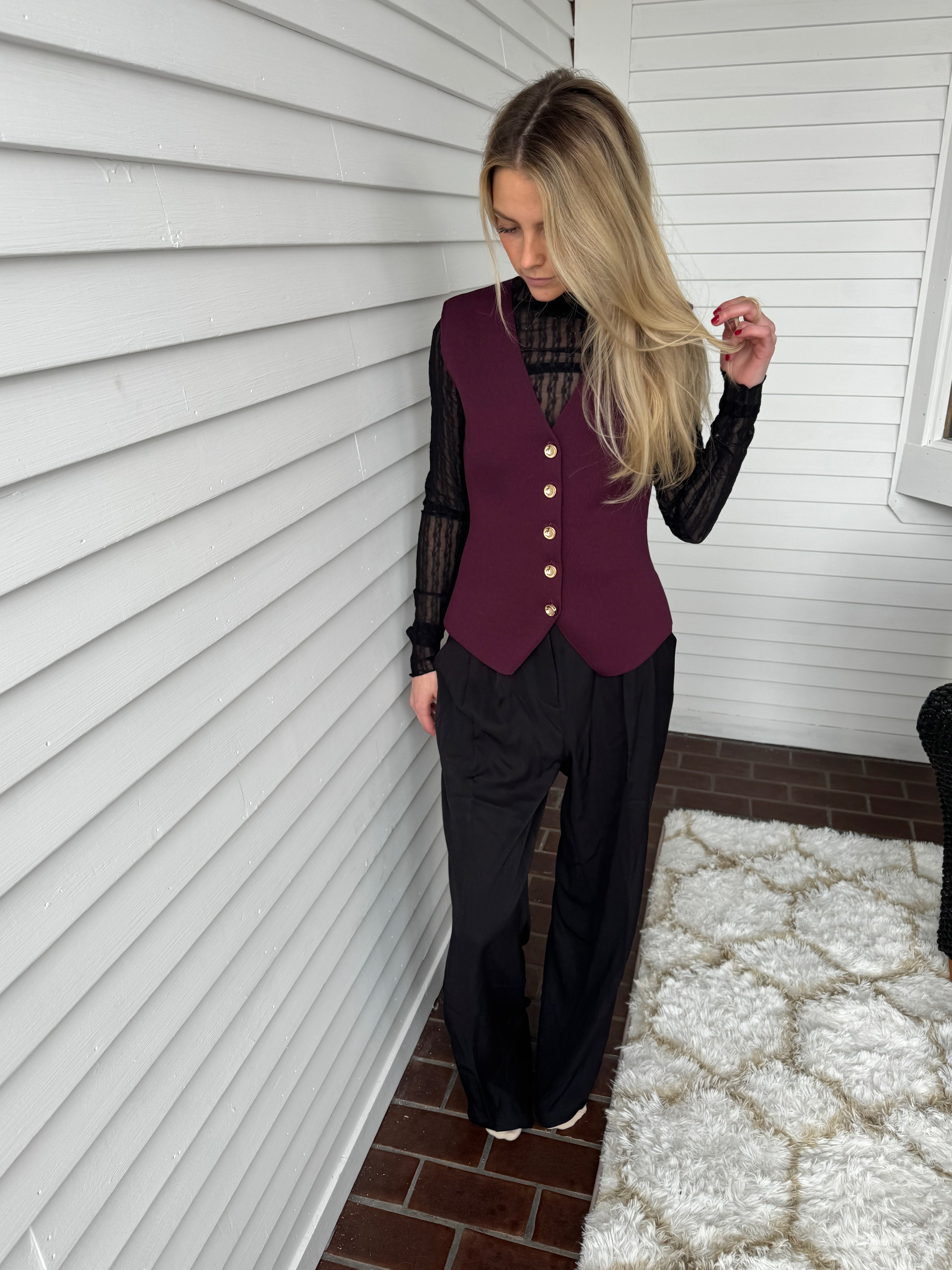 Welcome the cozy charm of autumn with Bloom's Vest in a rich plum hue. Perfectly crafted for warmth and style, this versatile sweater top adds a touch of elegance to any outfit. Whether paired with your favorite blouse or layered over a casual tee, its soft texture and relaxed fit provide comfort all day long. Ideal for those chilly days or nights, this vest effortlessly elevates your wardrobe, making it a seasonal must-have. Embrace the essence of fall fashion with Bloom's Vest and experience the perfect blend of comfort and style.