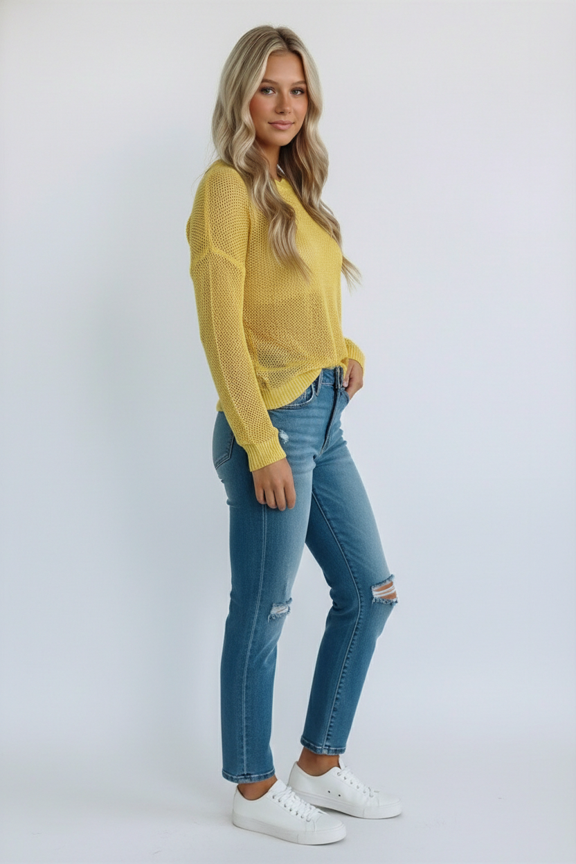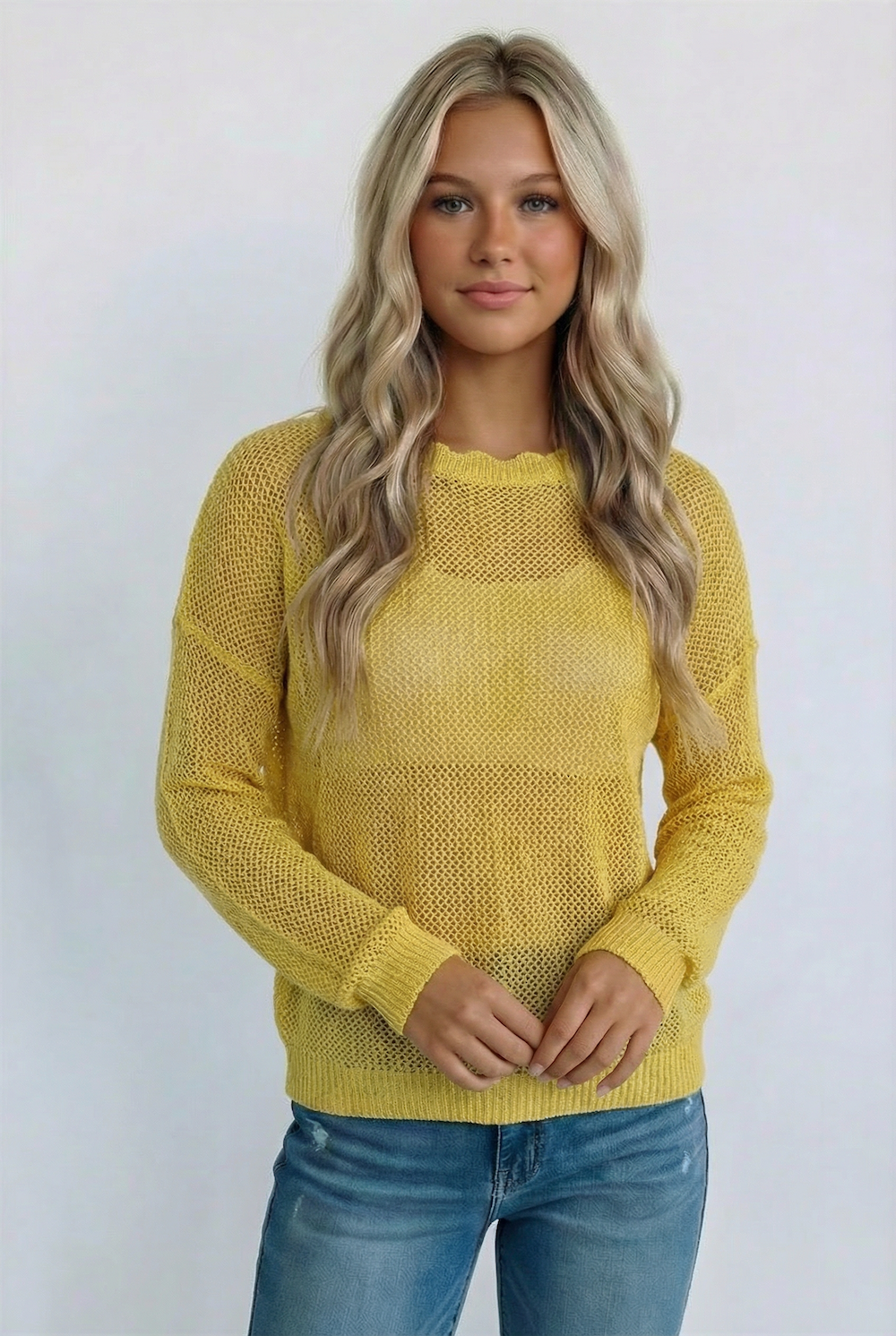 Distressed long sleeve sweater in vibrant neon yellow with sheer netted fabric and a distressed round neckline. The lightweight, see-through knit creates an edgy, layered look perfect for statement styling. Ideal for adding texture and bold color to any casual outfit.