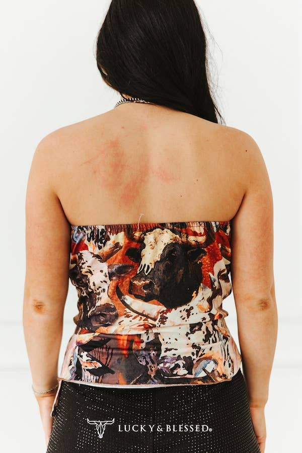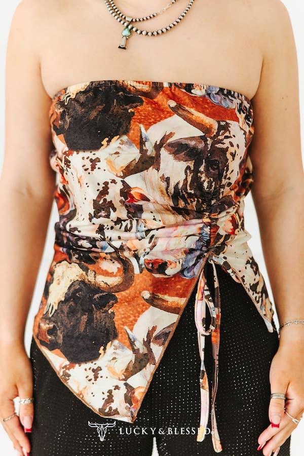 This bold and eye-catching western strapless top is a true standout piece for any western women’s wholesale boutique collection. Featuring a rich cow and longhorn-inspired print in warm tones of rust, chocolate brown, black, and ivory, this bandeau-style top captures the essence of modern western fashion. The detailed livestock artwork adds authentic ranch-inspired flair while keeping the look trendy and fashion-forward. Designed with a stretchy elastic back for a secure and comfortable fit, this piece also features a flattering front wrap detail with an adjustable tie accent that enhances the waistline. The asymmetrical hemline adds movement and shape, making it perfect for styling with high-waisted skirts, distressed denim, statement belts, or turquoise accessories.