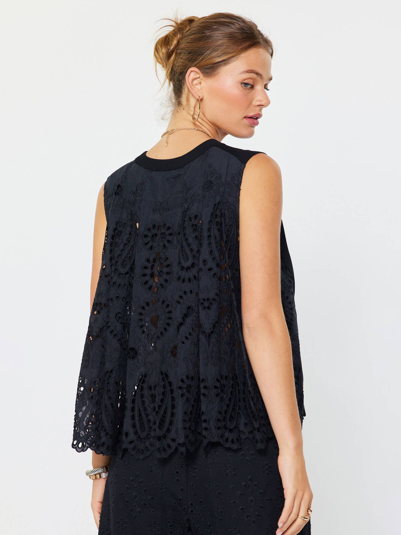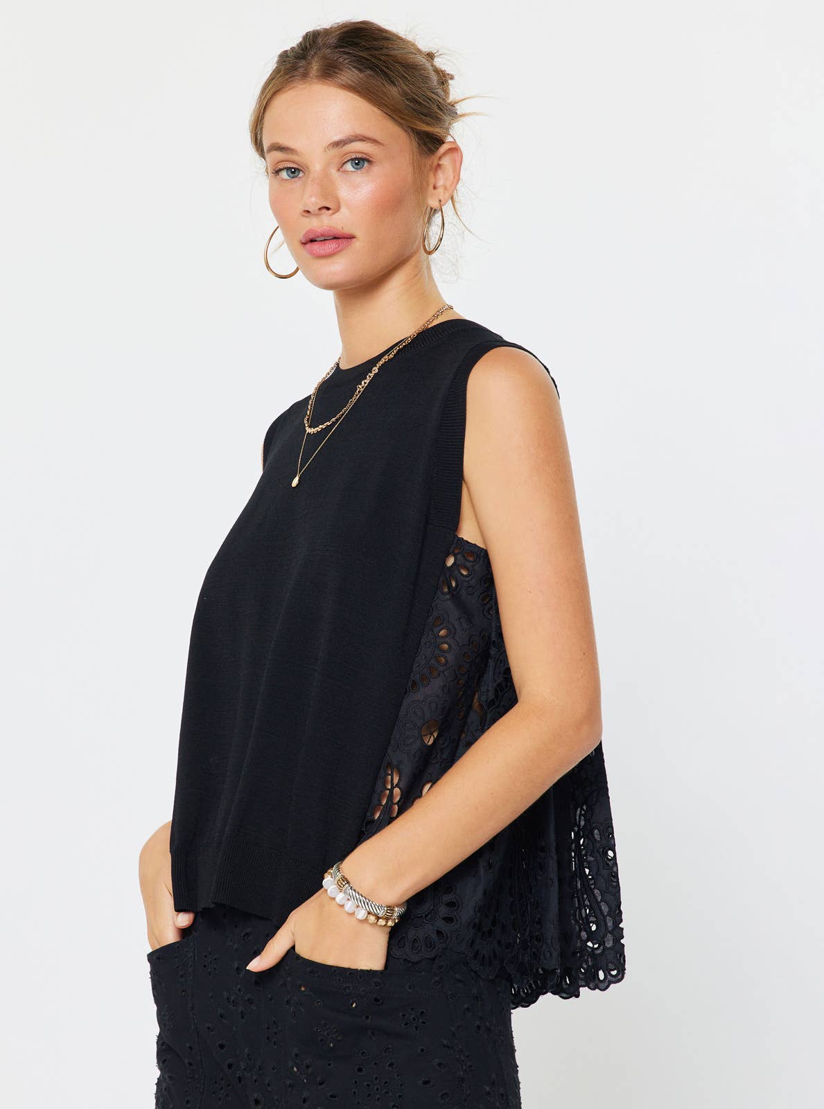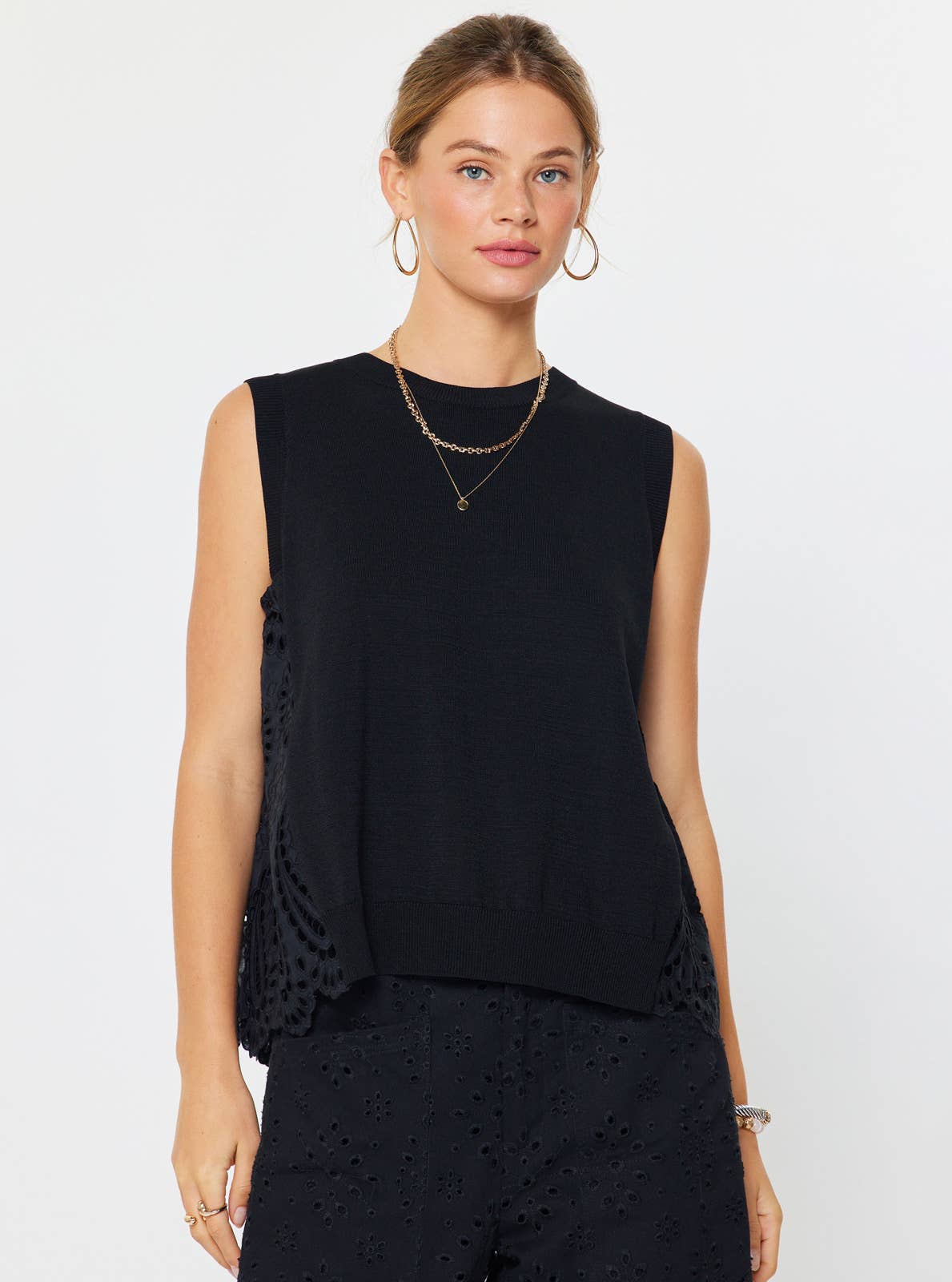 Effortless elegance meets modern edge with Trinity's Top in classic black. This sleek round-neck sleeveless sweater features a striking contrast pleated eyelet back—the perfect unexpected detail that transforms a wardrobe staple into a statement piece. Layer it over your favorite tee or wear solo for an instantly polished look that works from coffee runs to night out. Versatile, chic, and undeniably cool.