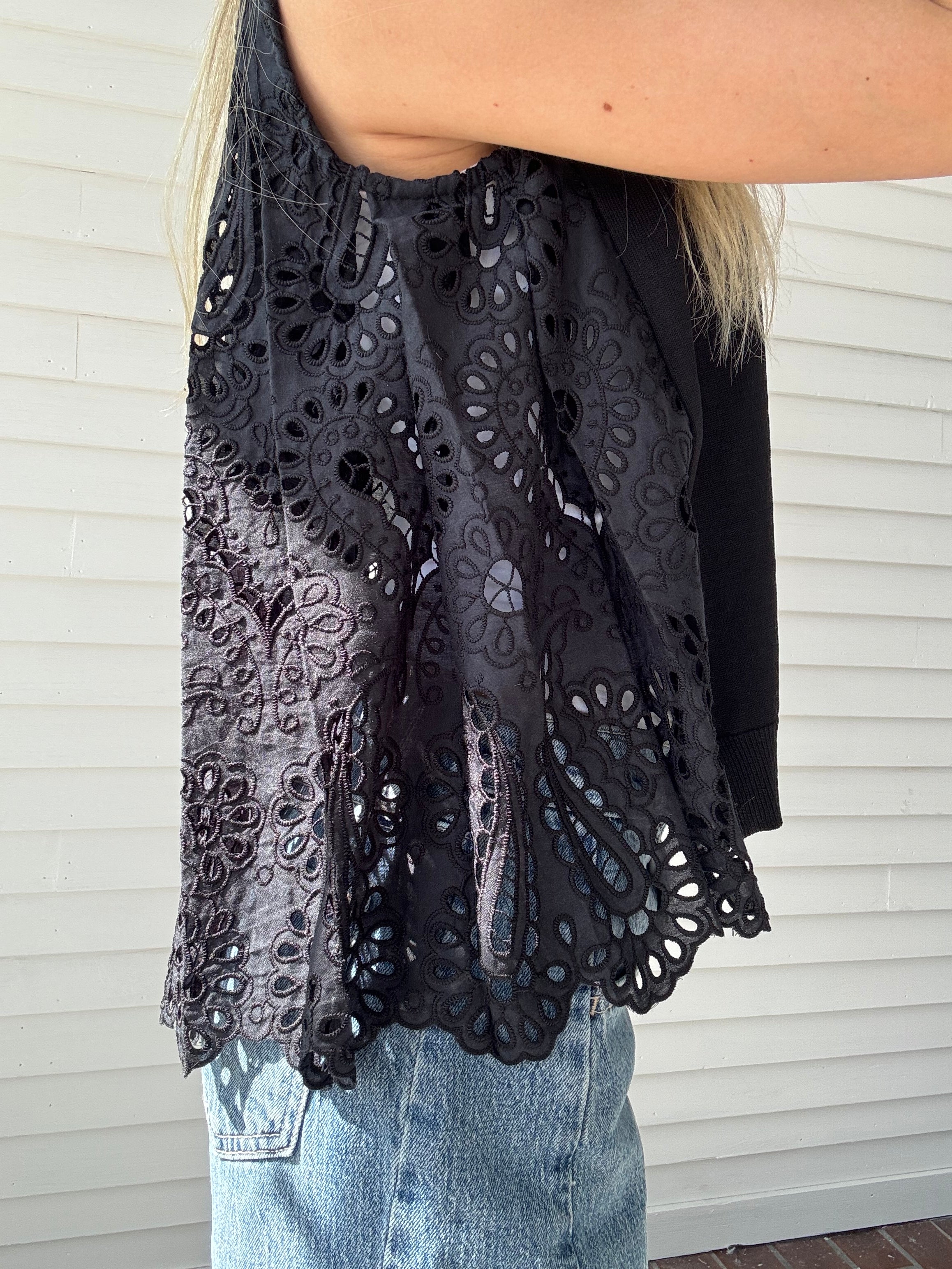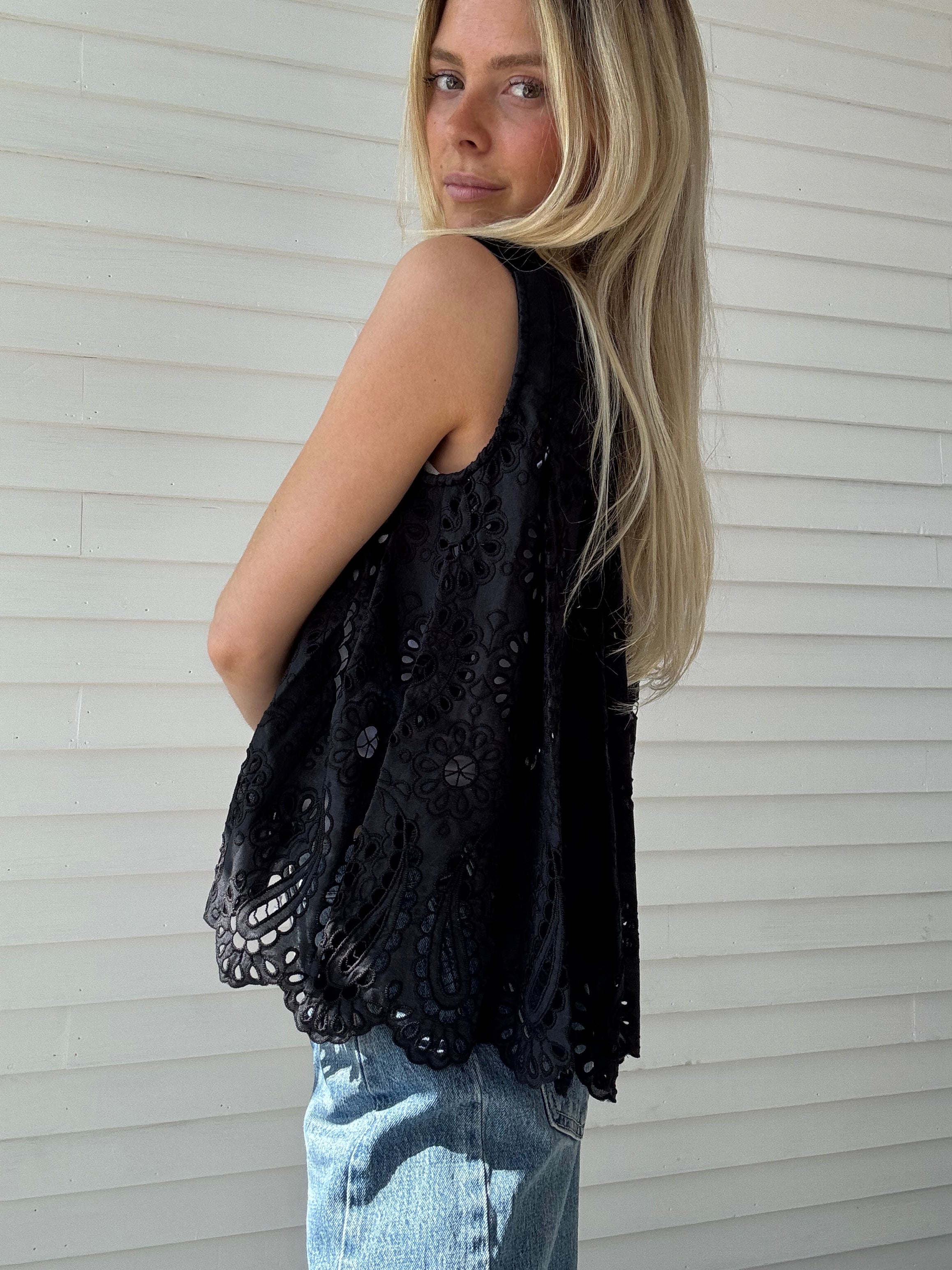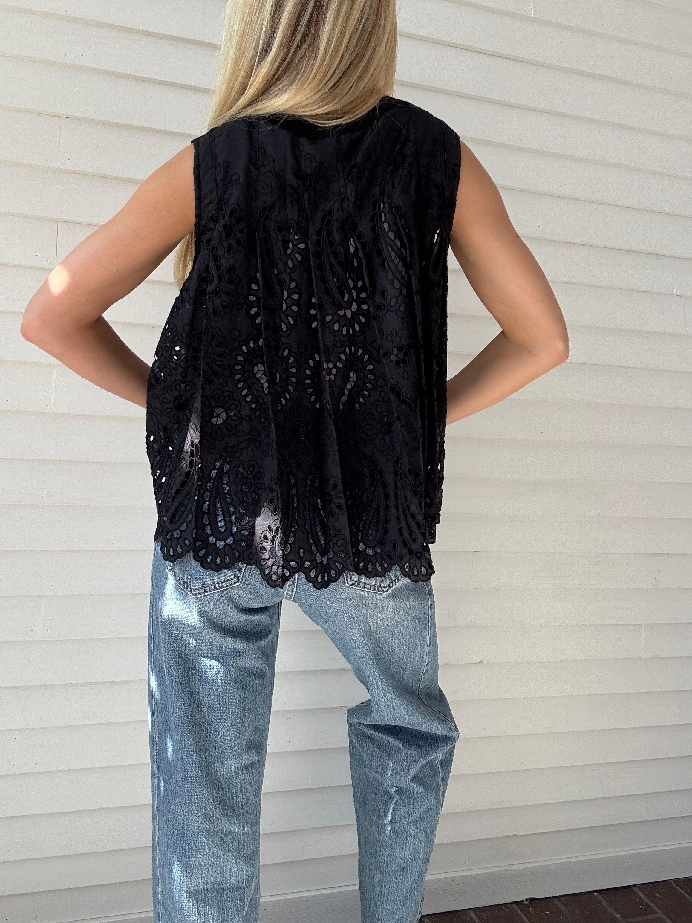Effortless elegance meets modern edge with Trinity's Top in classic black. This sleek round-neck sleeveless sweater features a striking contrast pleated eyelet back—the perfect unexpected detail that transforms a wardrobe staple into a statement piece. Layer it over your favorite tee or wear solo for an instantly polished look that works from coffee runs to night out. Versatile, chic, and undeniably cool.