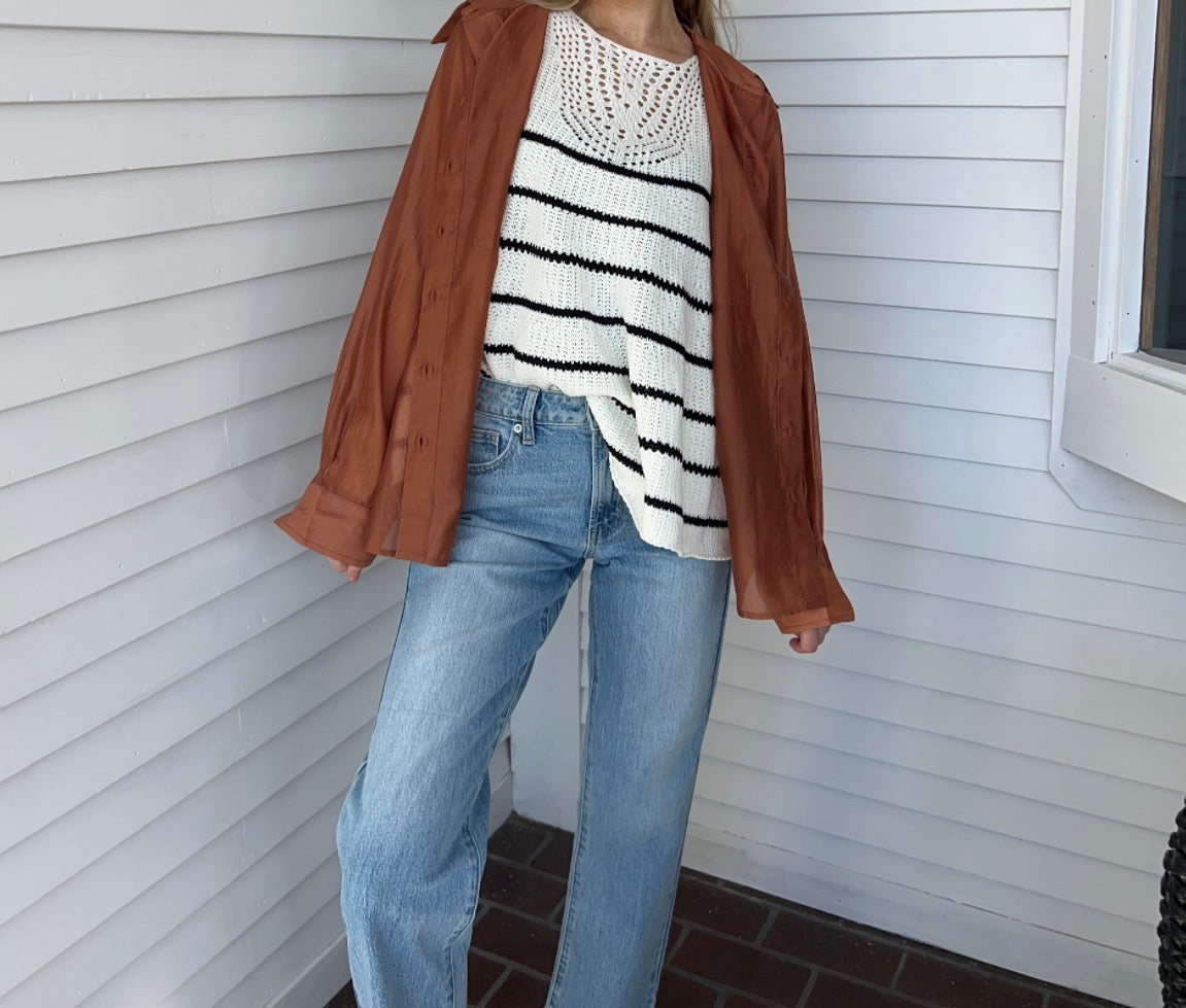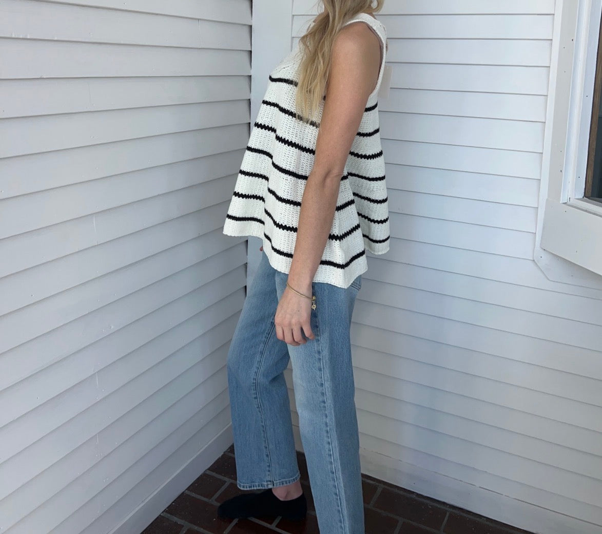Juniper's Top is a timeless striped knit tank designed for everyday versatility. Featuring a refined open-stitch neckline and graceful A-line cut, this sleeveless piece offers a polished silhouette that works seamlessly across seasons. The quality knit fabric provides comfortable drape, while classic black and white stripes ensure it coordinates effortlessly with your existing wardrobe. An understated essential that transitions from casual to dressed-up with ease. Runs Large