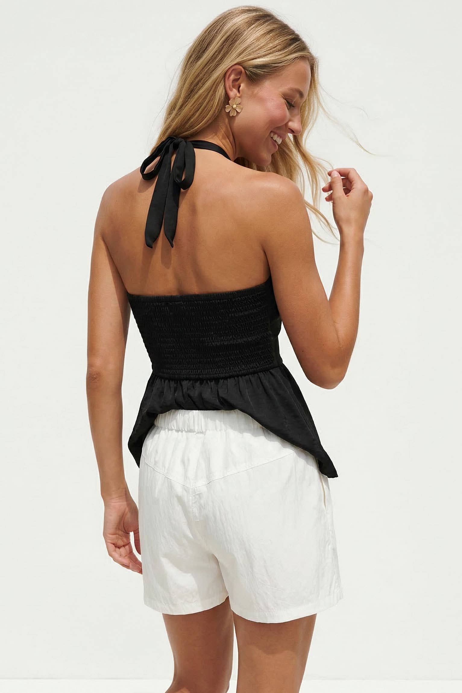 Turn heads in this flirty Silky Beaded Halter Top. The ruched bust and peplum silhouette create a flattering fit, while delicate beads at the neckline add just the right amount of sparkle. Lightweight and breathable, it's your new go-to for beach days, parties, or casual outings. Pair with shorts, jeans, or a skirt for endless styling options. Fabric: 100% Polyester | Hand wash cold