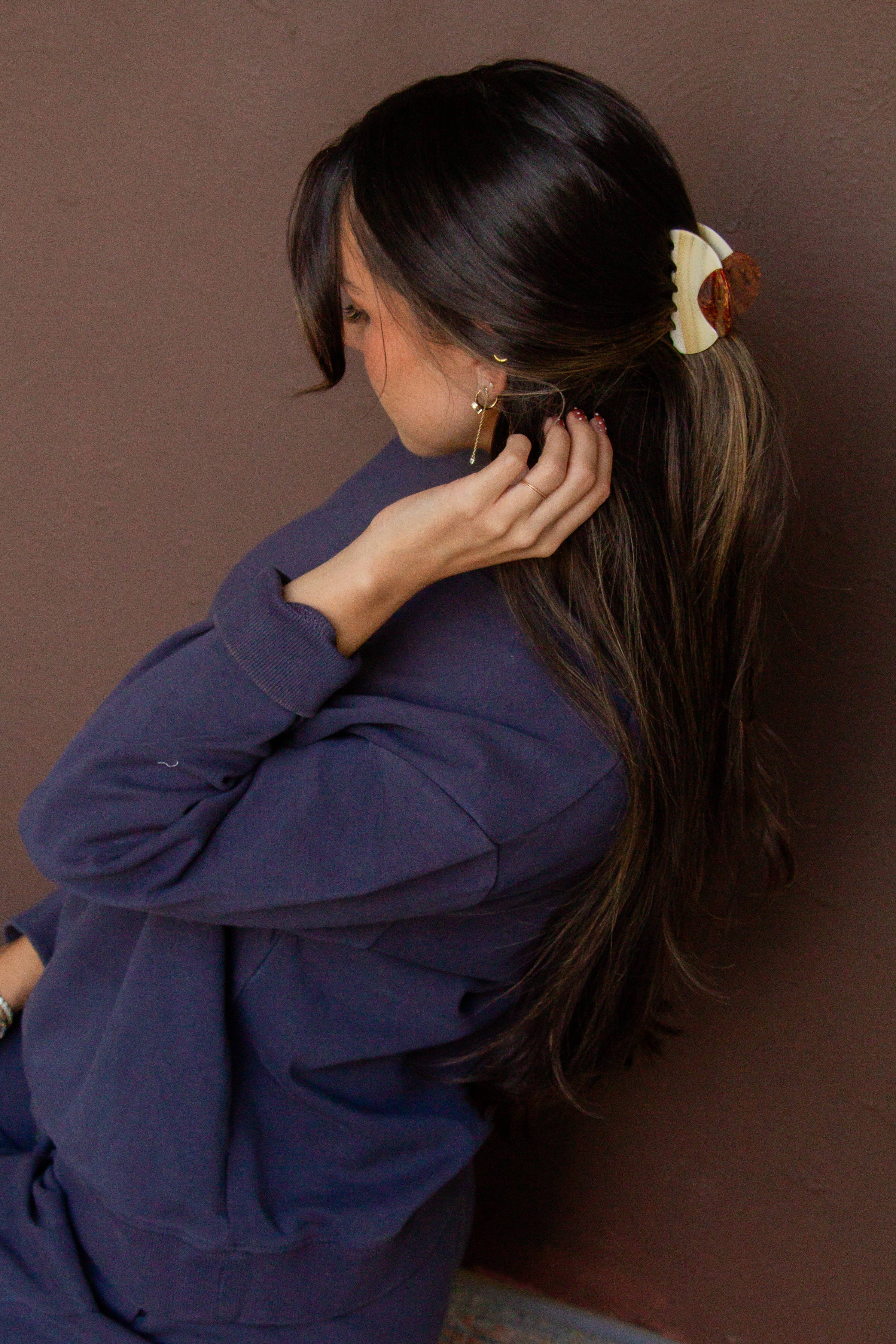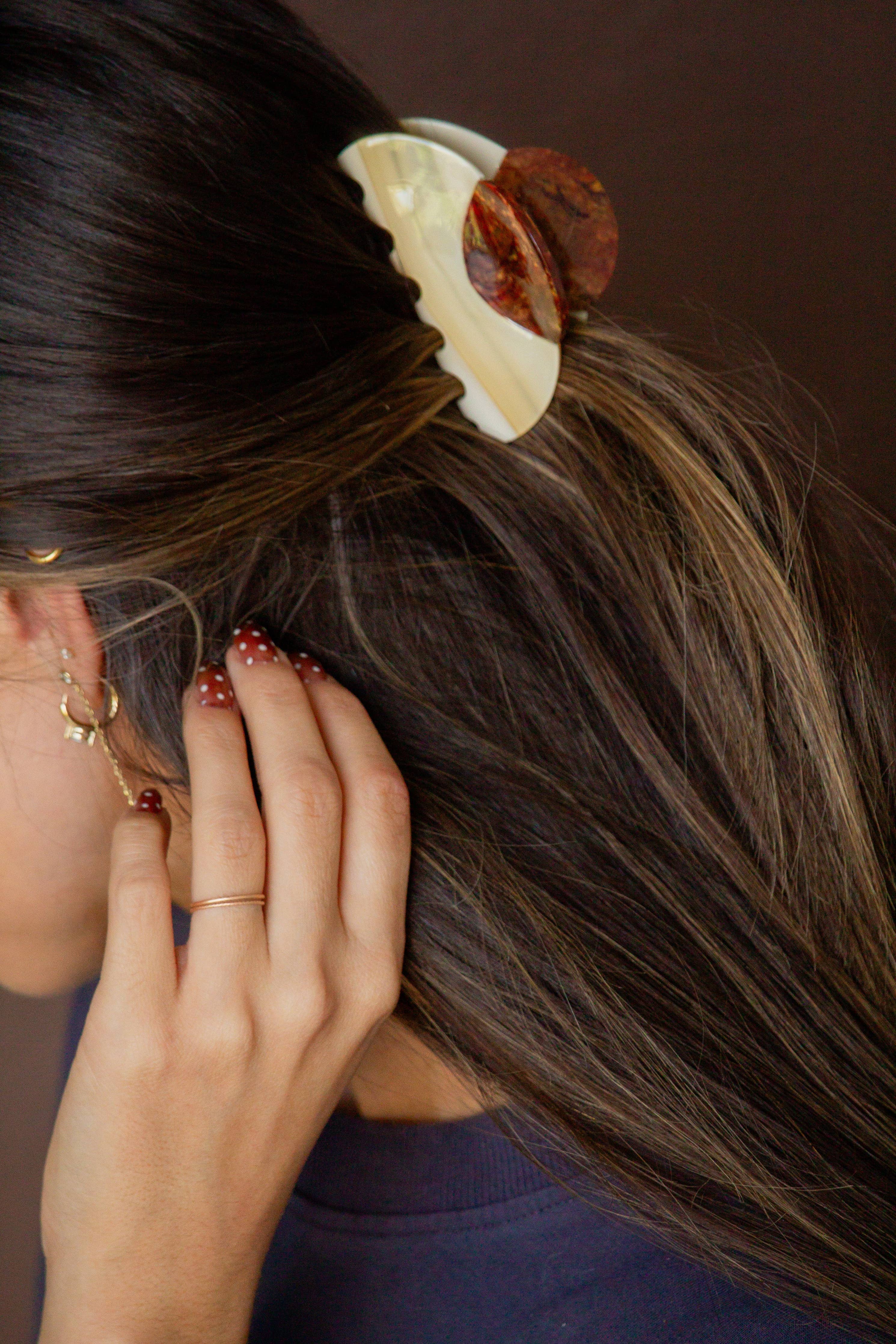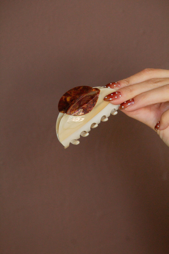 This unique & stunning claw clip is the perfect size, and is the absolute perfect neutral color combo for this time of year! The best way to elevate your updo for the day. This is a medium size claw clip measuring at 3 inches.