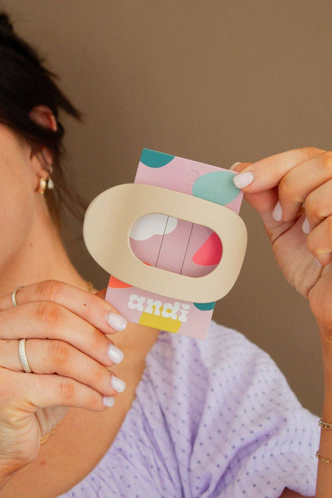 These round cutout, flat claw clips are so cute and functional! Their shape makes them so comfortable during any activity. How often can you find an accessory that is unique and cute but also, so incredibly practical? Wear it every day around the house, during your workouts, to work, or for your next girls night, it'll always match the vibe. It is a large 3.75 inch flat claw clip.