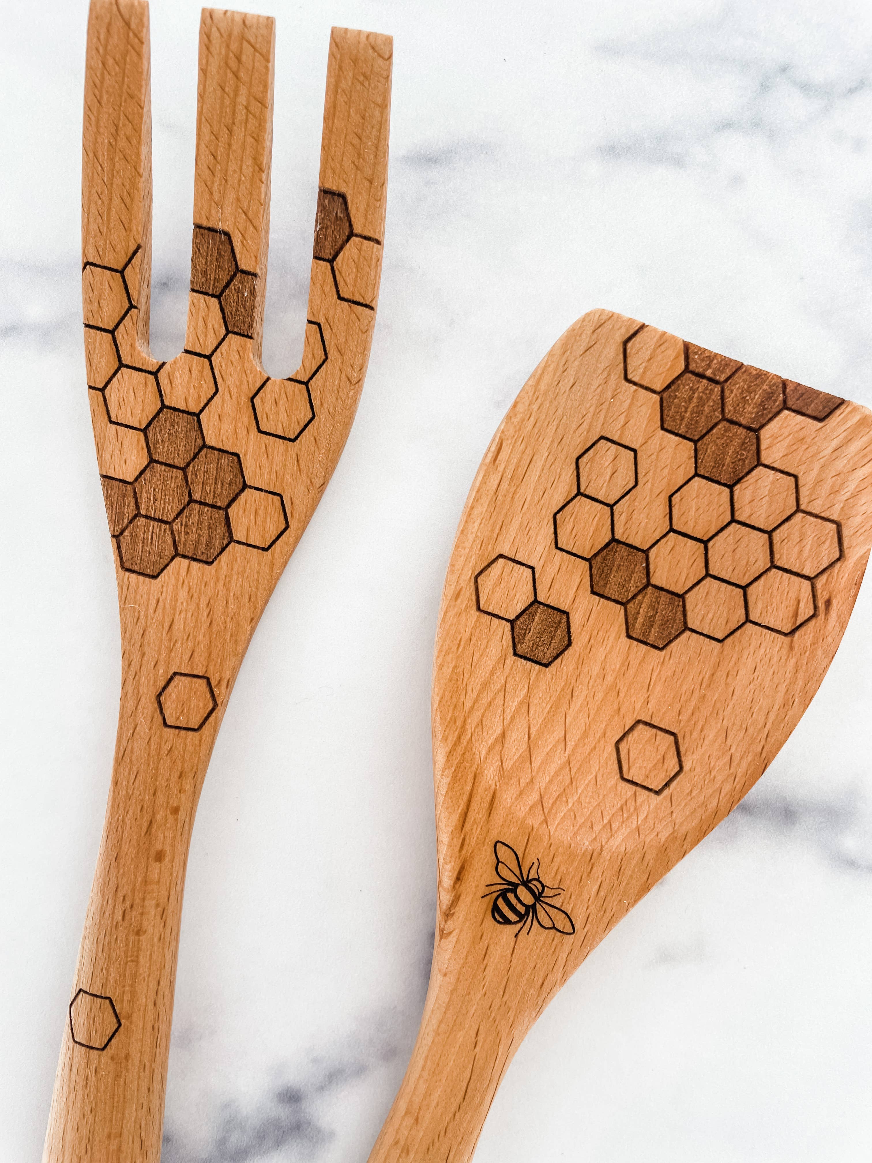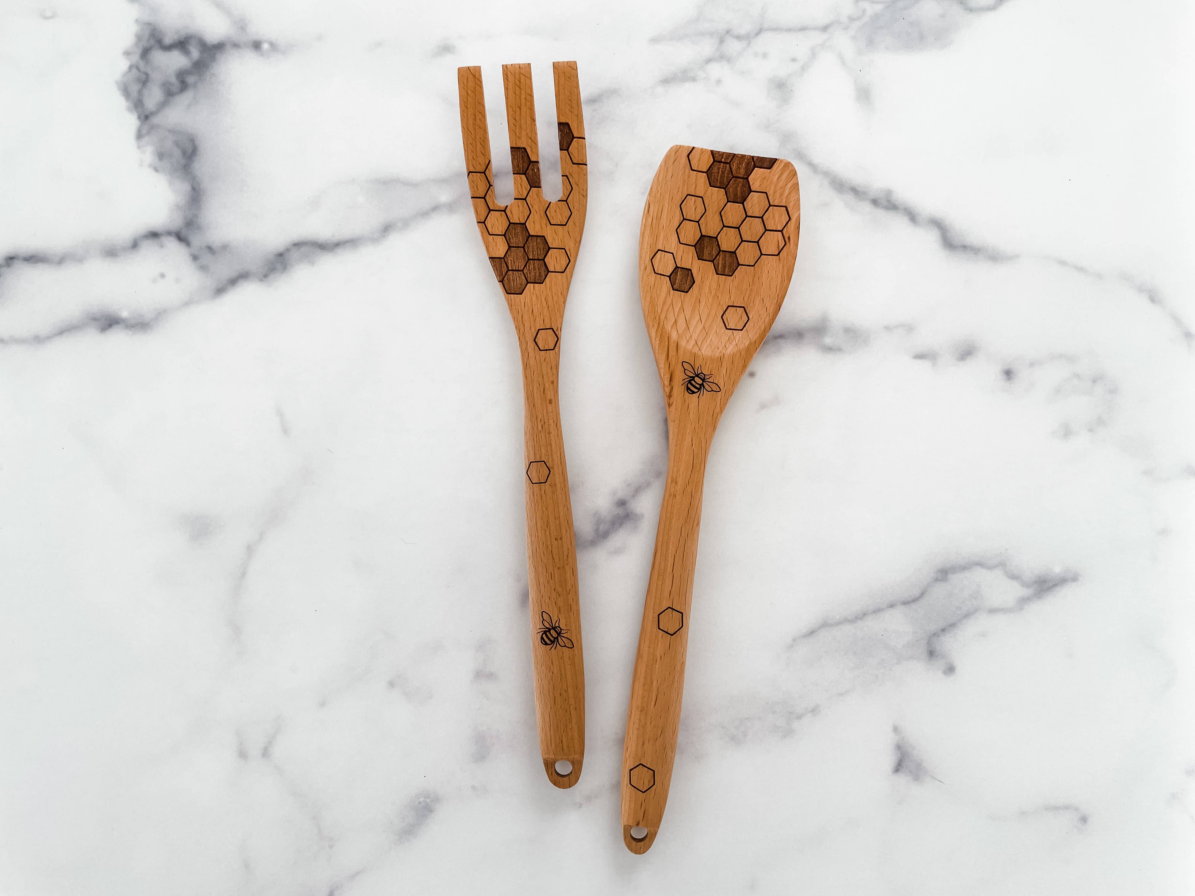 Inspired by nature and crafted with care, our Honey Bee Wooden Spoon & Fork Set brings a touch of sweetness to the kitchen. Made from natural beechwood, each piece features a honeycomb-inspired hex design with a delicate honey bee illustration printed on the utensil—celebrating the beauty of simple, intentional living.