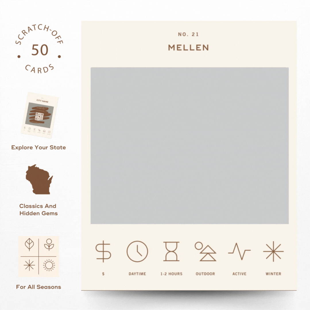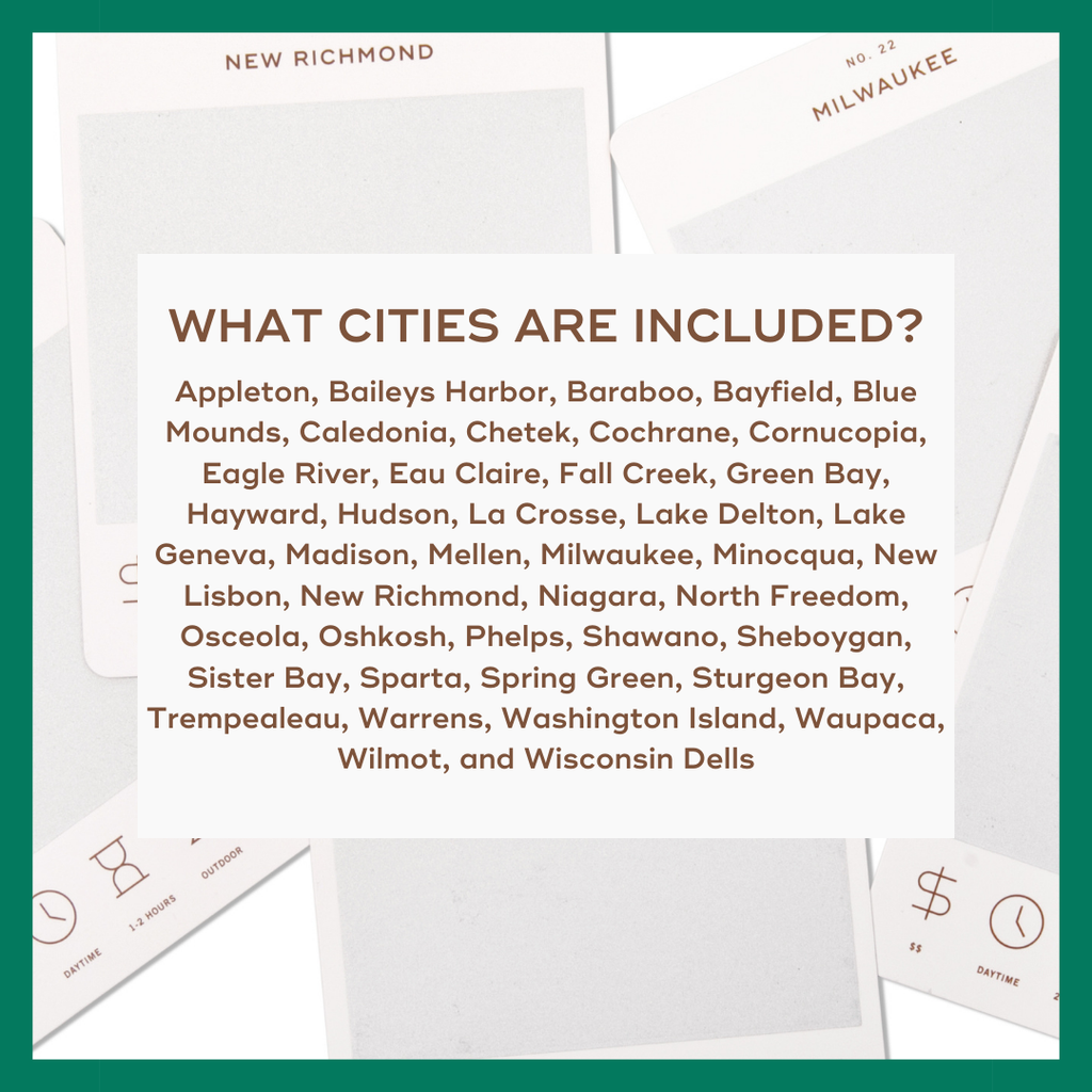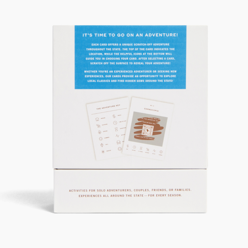 50 scratch off bucket list adventures around the state of Wisconsin. Pick a city that you want to explore, check out the icons at the bottom of the card to determine the season, cost, and time of day, and then scratch off the card to reveal your adventure!