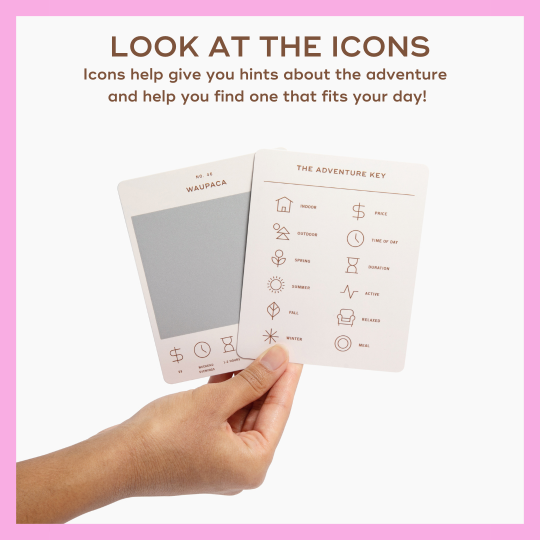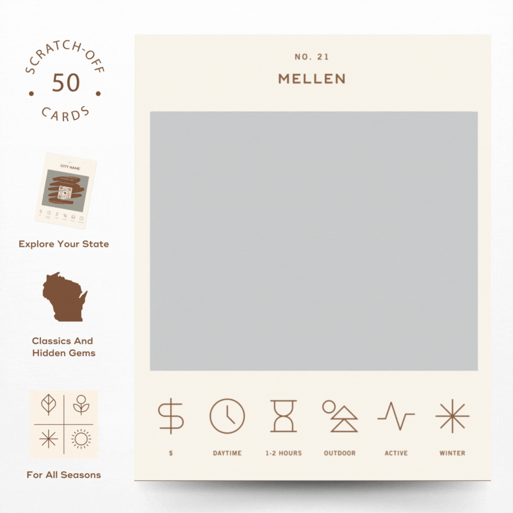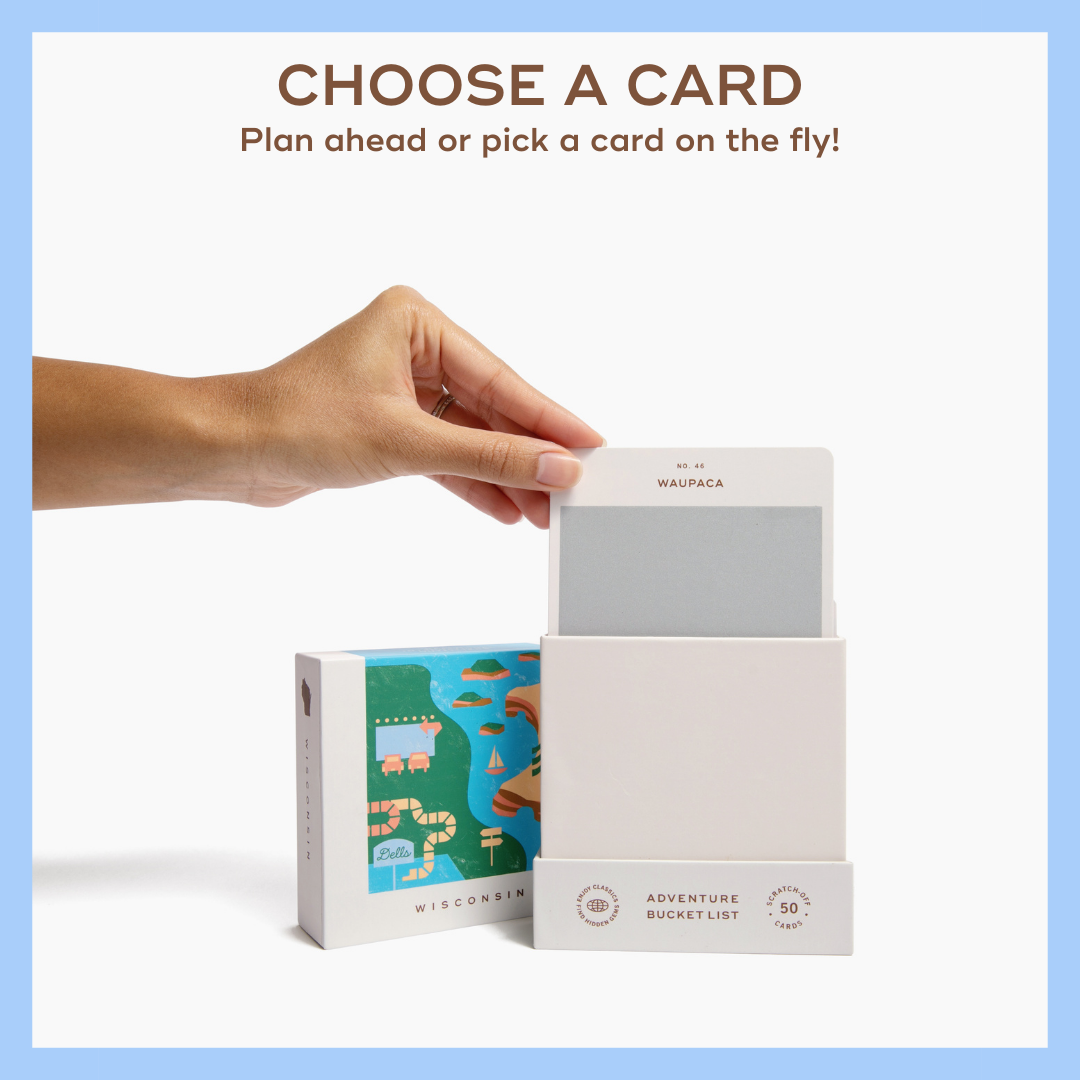 50 scratch off bucket list adventures around the state of Wisconsin. Pick a city that you want to explore, check out the icons at the bottom of the card to determine the season, cost, and time of day, and then scratch off the card to reveal your adventure!
