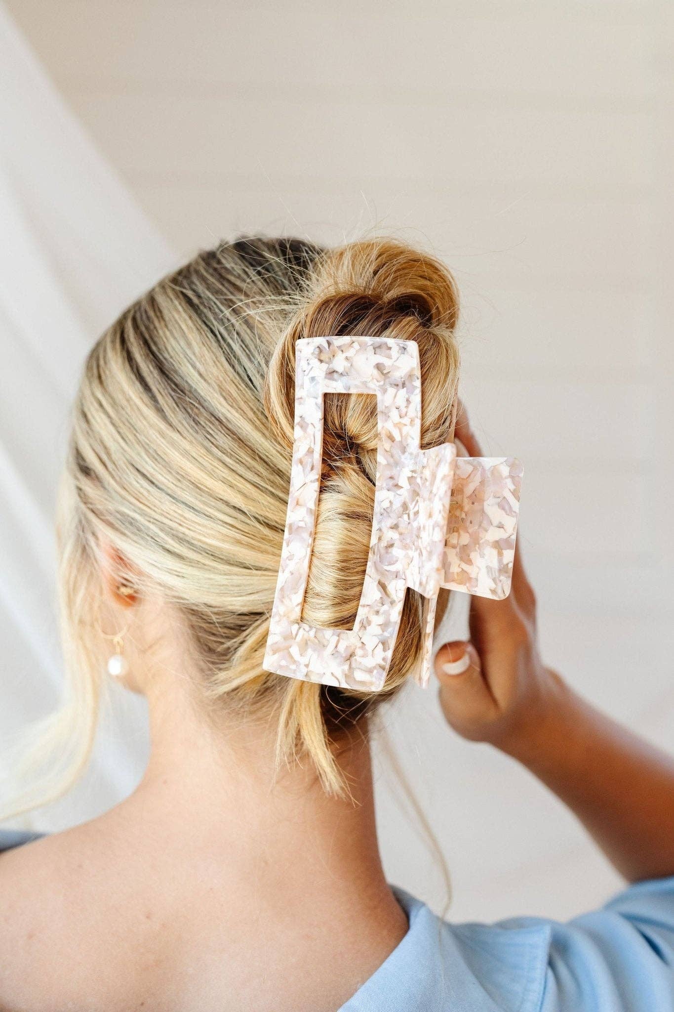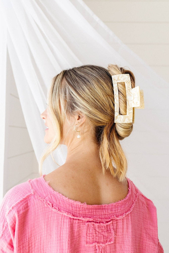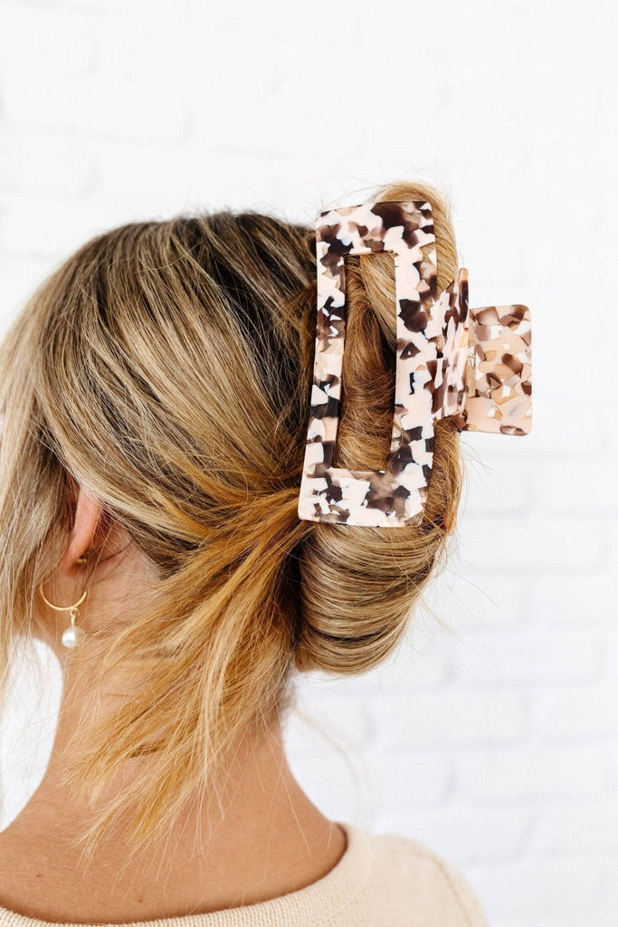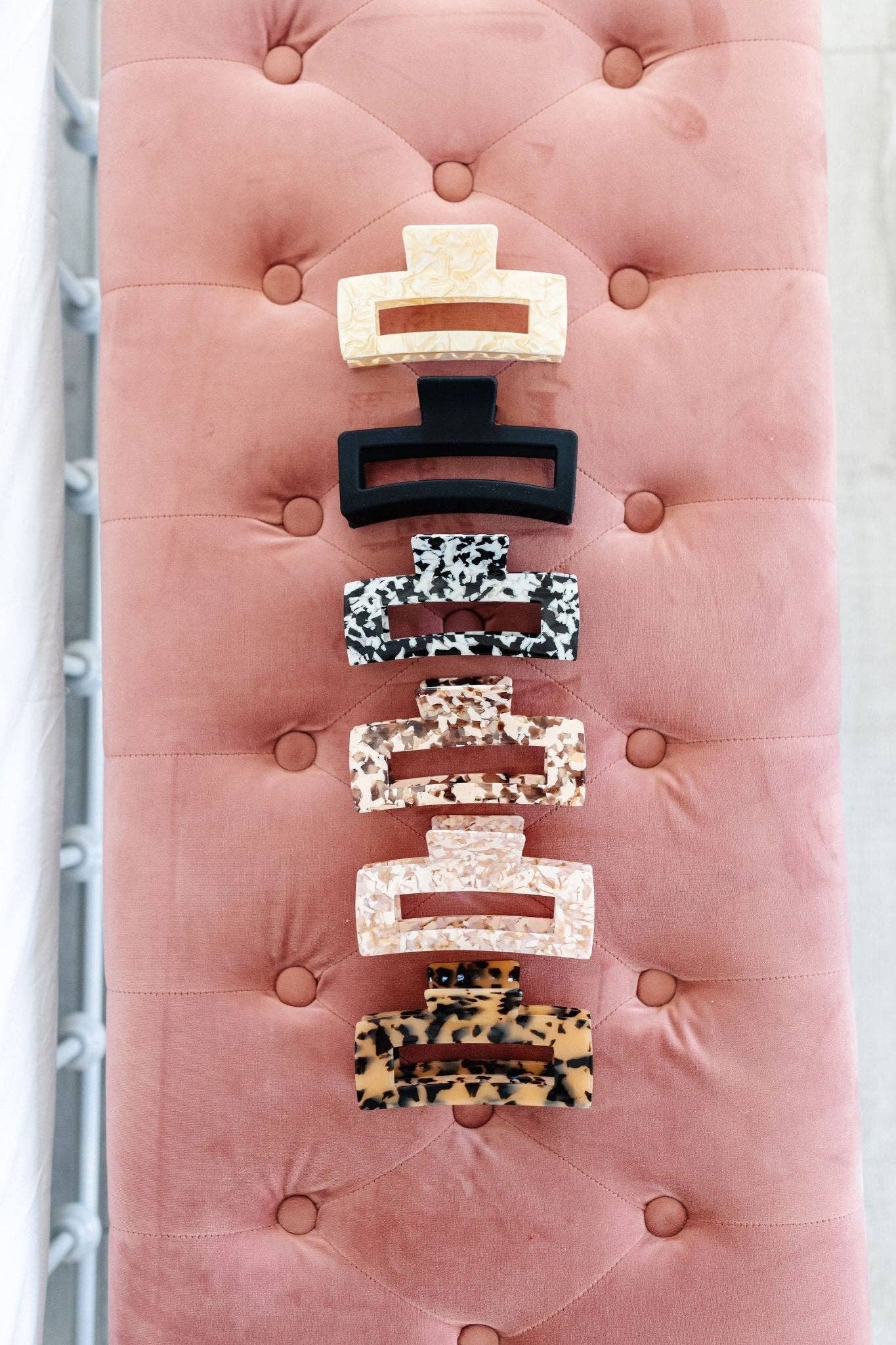 These XL rectangle claw clips are here to make a statement! They are 5 inches long and perfect for a hairdo that will last all day long. They come in five different colors; black/white marble, cream marble, pink marble, and peach/brown marble! These are some of our best clips for thick hair!
