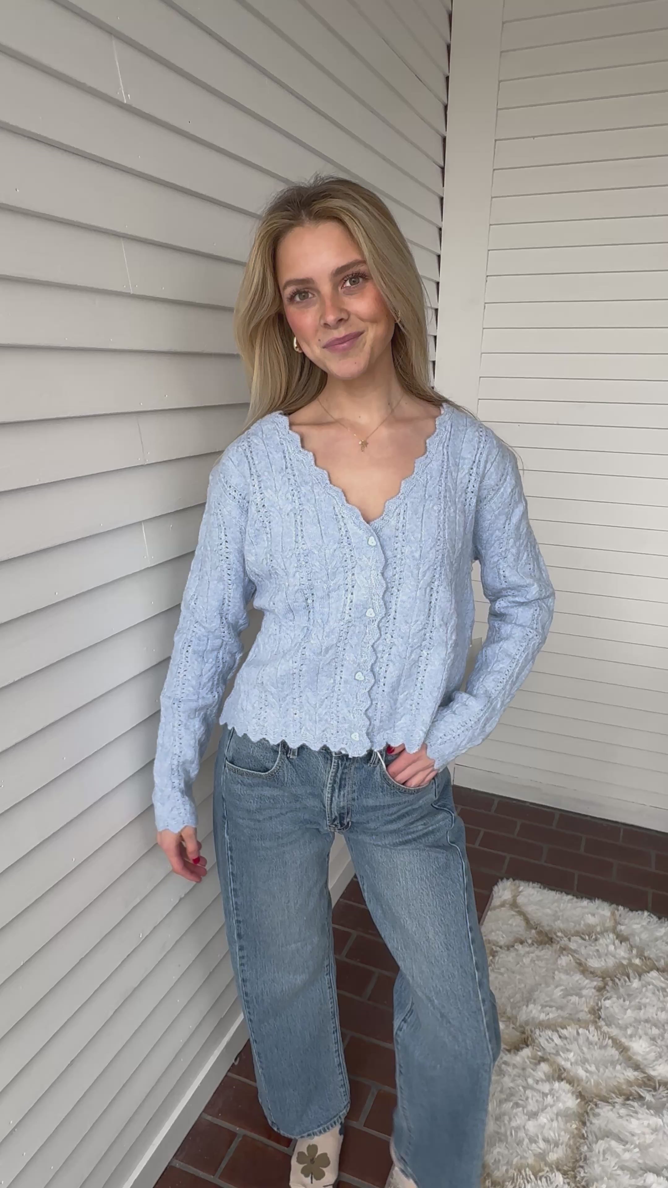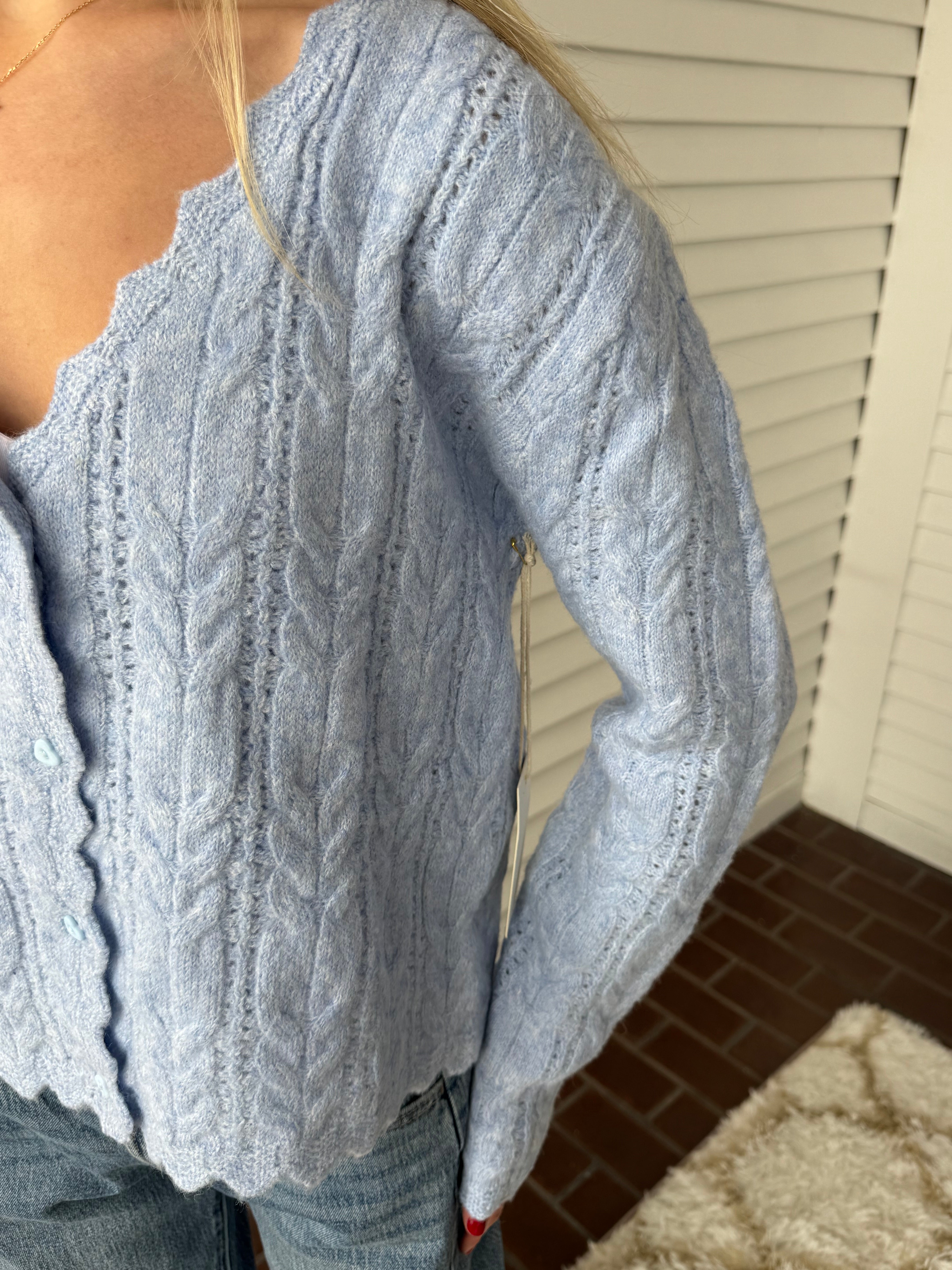 The Scallop Hem Cable Knit Cardigan brings a romantic twist to a classic knit. Crafted with a soft cable pattern and finished with a delicate scalloped hem and neckline, this button-front cardigan offers a cozy yet feminine look. Its pastel hue adds a dreamy touch, perfect for layering over dresses or pairing with high-waisted denim for an effortlessly chic style.