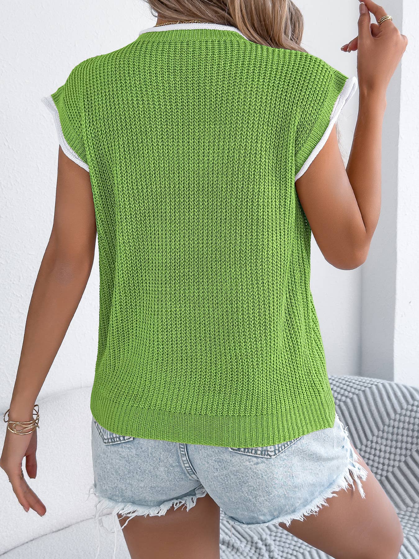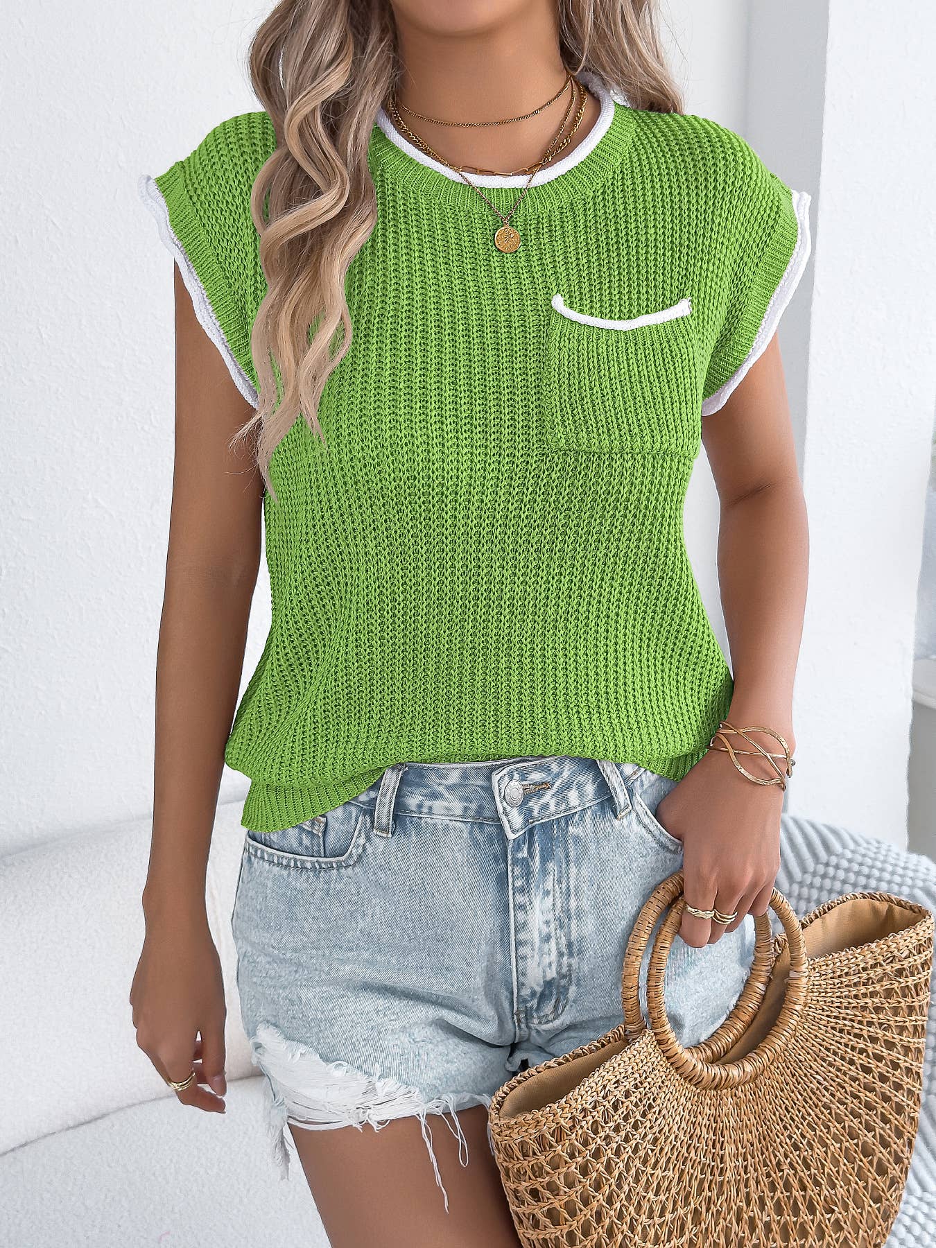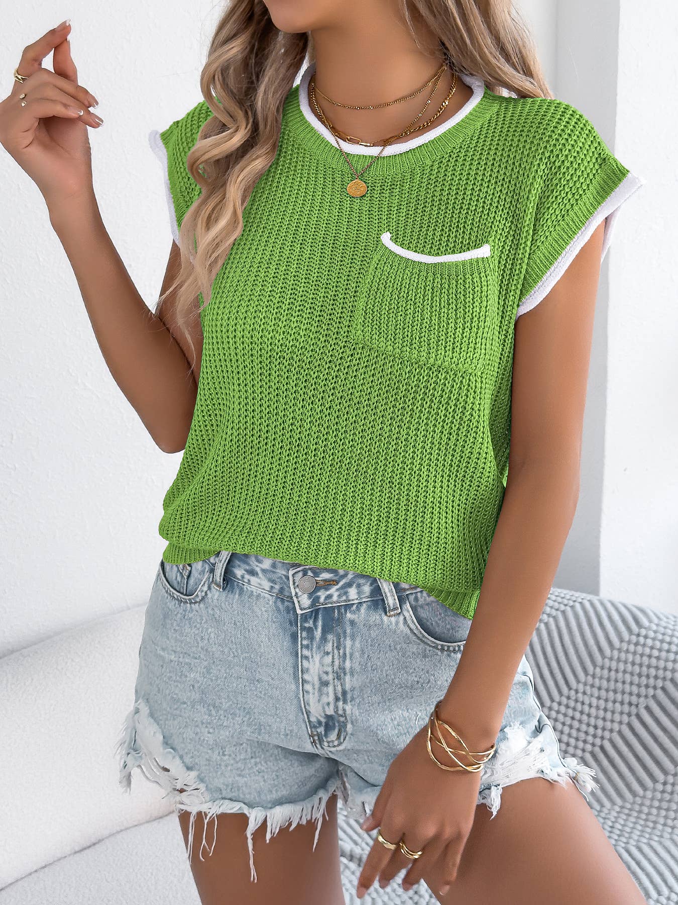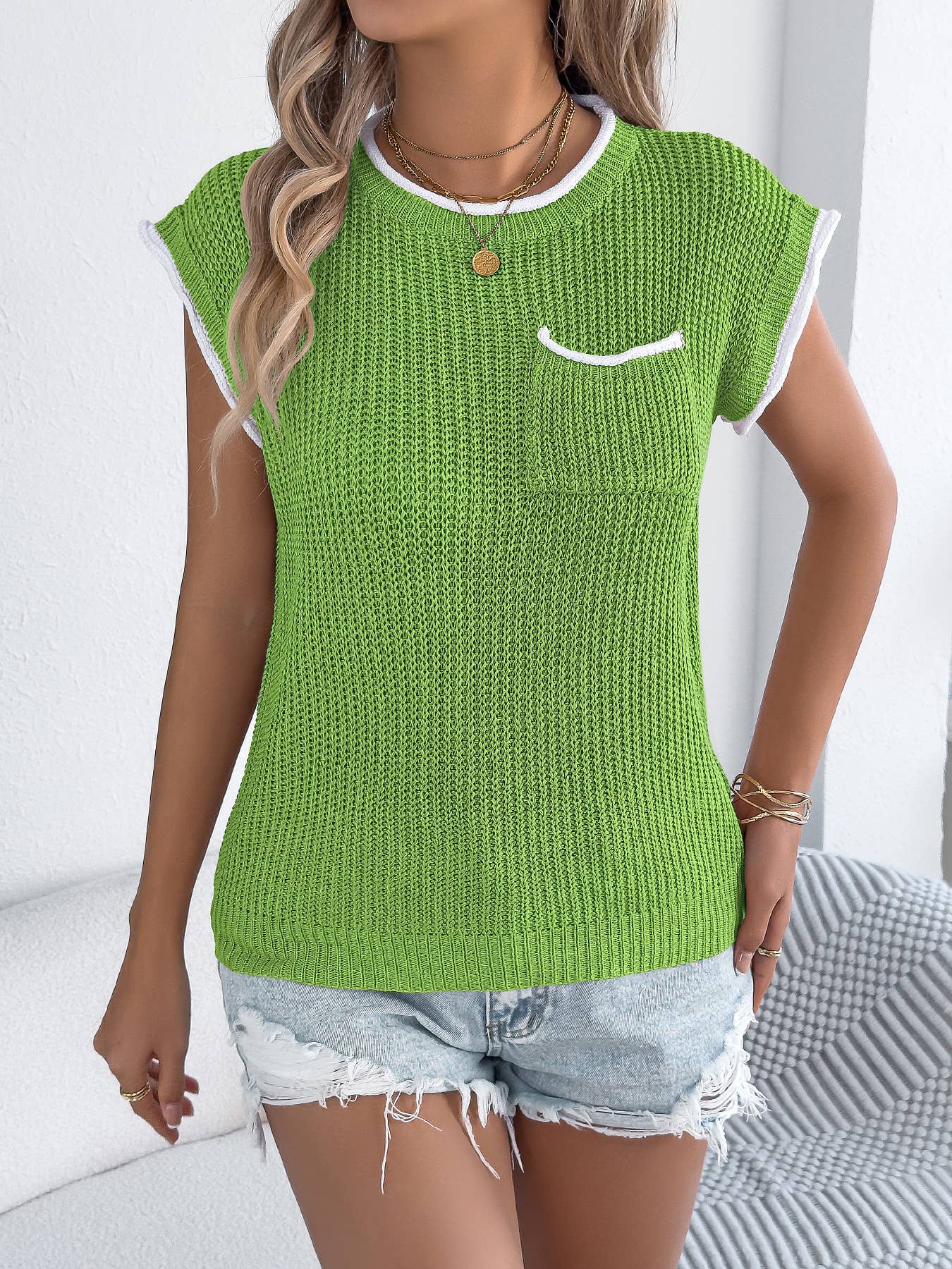 This short sleeve ribbed knit pullover top features a finely textured waffle-style knit that adds subtle dimension to a clean, modern silhouette. Designed with a classic round neckline, it includes contrast trim along the collar and sleeves for a polished, elevated finish. A small chest pocket adds a touch of casual charm while maintaining a streamlined look. The relaxed fit offers comfort without sacrificing structure, making it easy to style tucked or untucked. Lightweight yet substantial, this knit top pairs effortlessly with denim, shorts, or skirts for a timeless, versatile wardrobe staple.