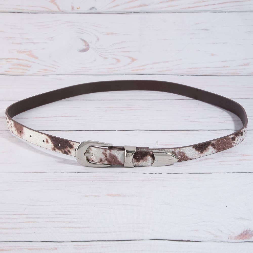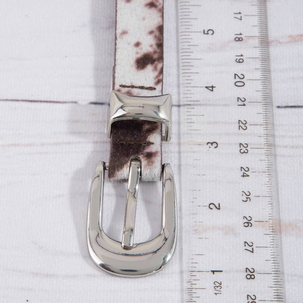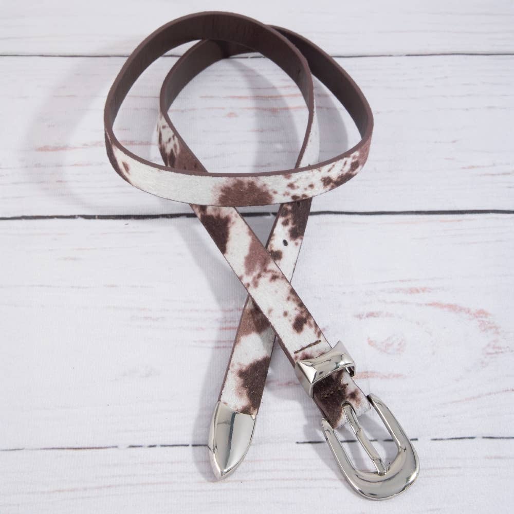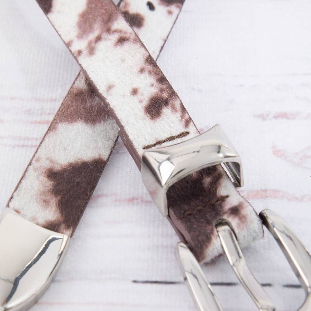 A stunning piece that is sure to turn heads, this belt highlights a special faux cow hide fashion design. This item is perfect for adding some color and vibrancy to any outfit. Available in BK, BR. This item is sold in packs of 1.