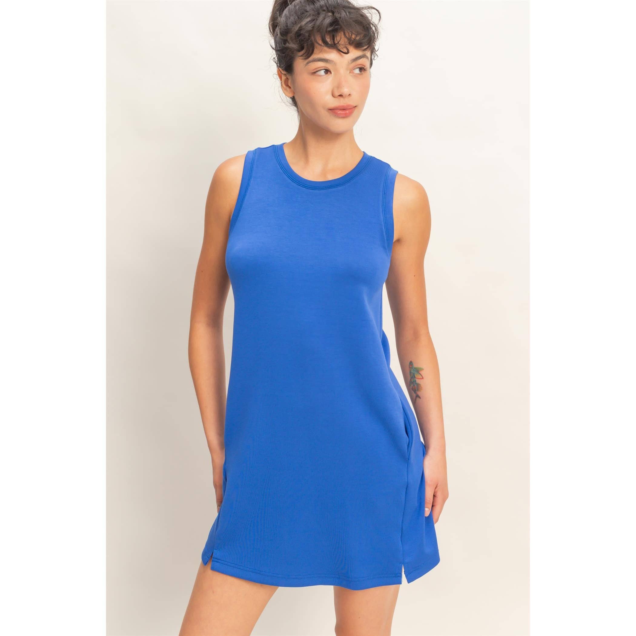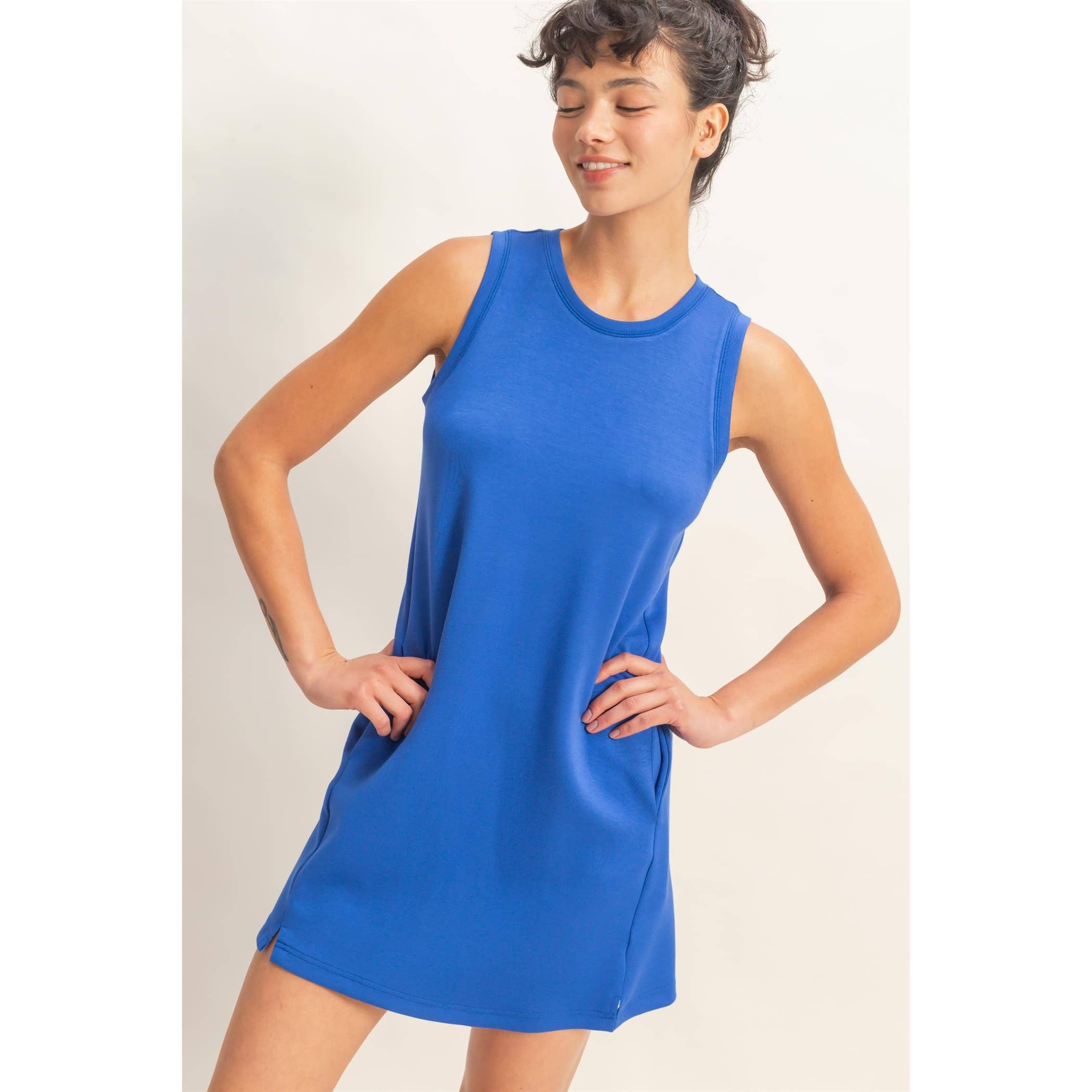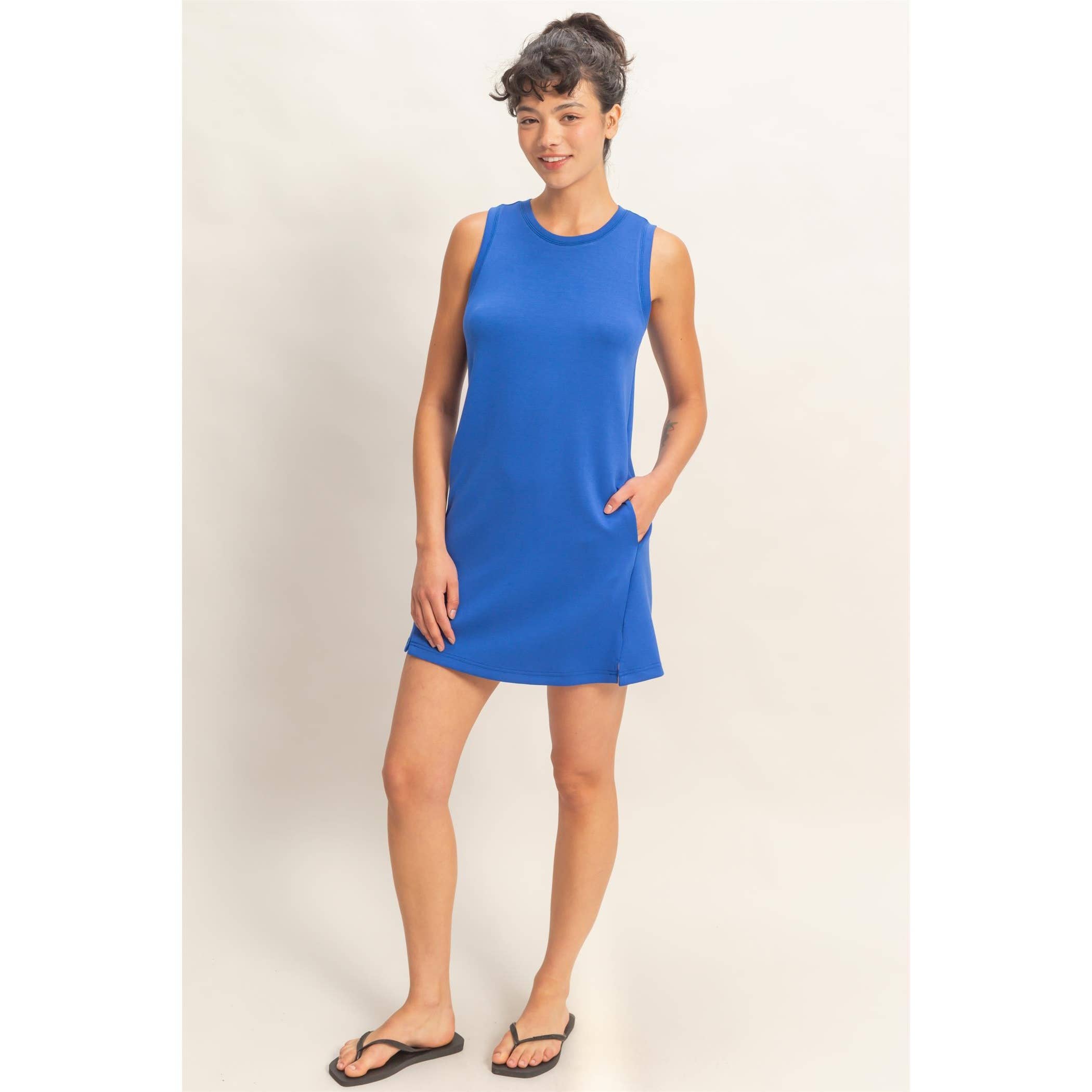 Slip into effortless style with Becki's Dress in stunning cobalt blue. This chic tank mini dress combines a flattering crew neckline with a sleek, contemporary silhouette—plus hidden side pockets for practical elegance. Layer it with a bold shawl or cinch it with a statement belt to create endless looks. Perfect for warm weather adventures, coffee dates, or nights out. Designed in the USA for quality you can feel. Get ready to turn heads and feel amazing.