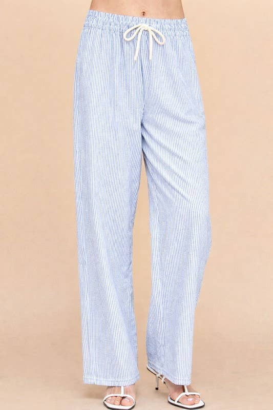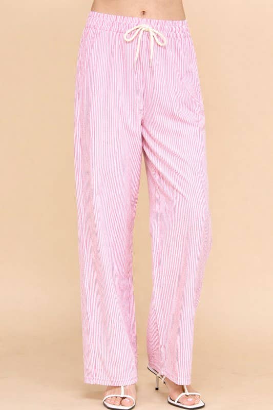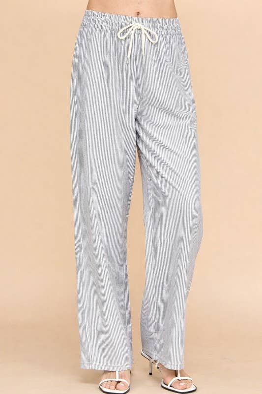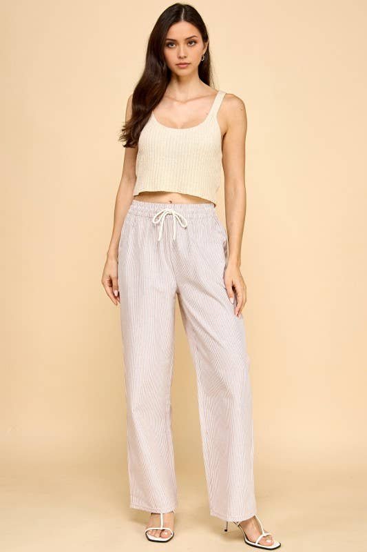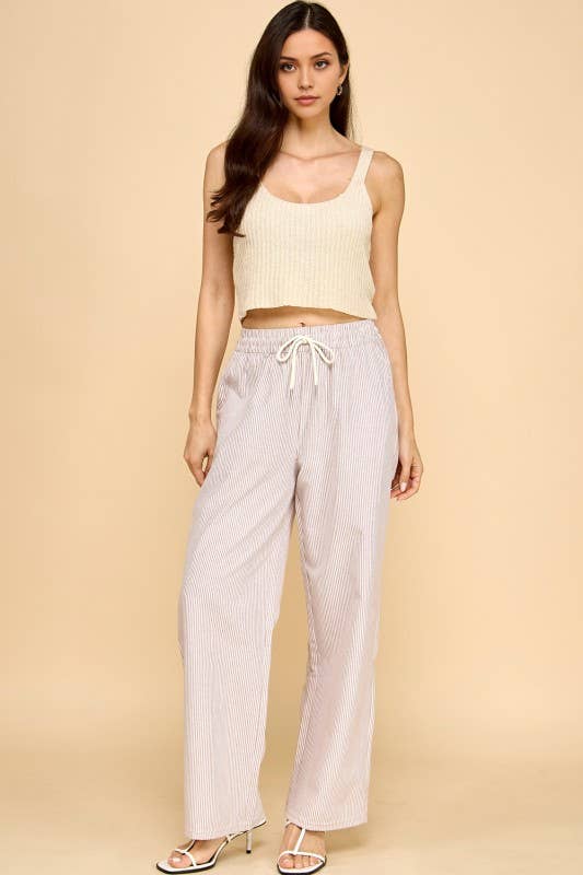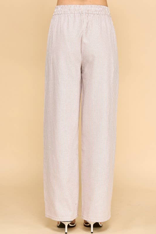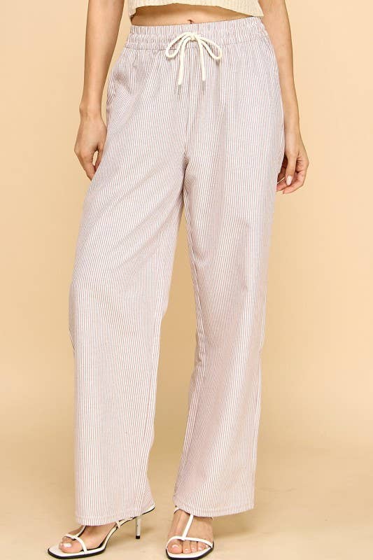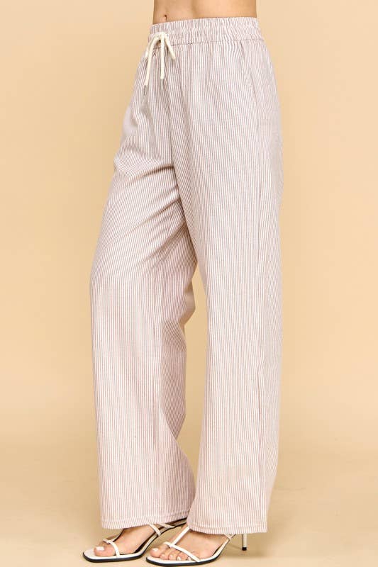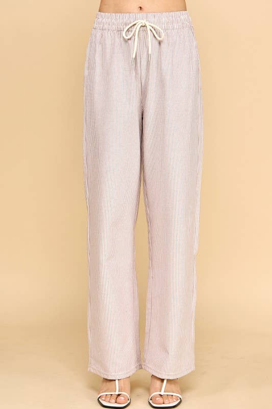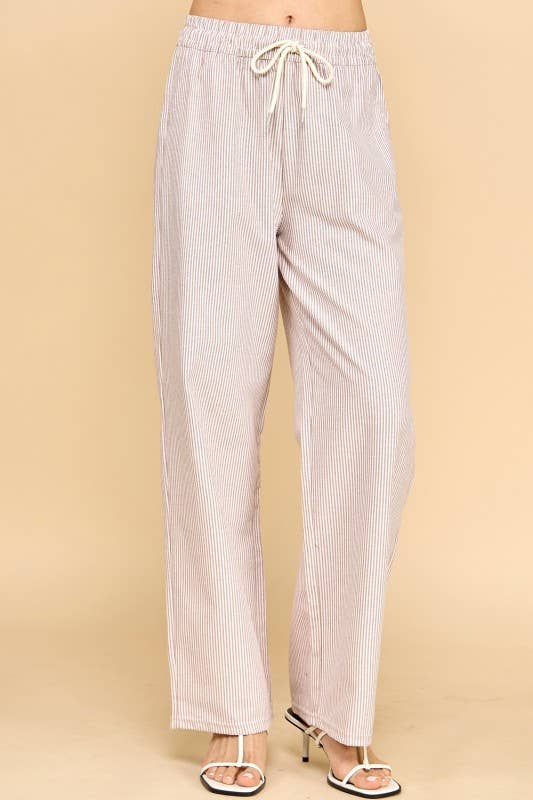 Effortless style meets comfort in these vertical stripe straight pants. Featuring a cream and mocha color palette, these lightweight bottoms are perfect for casual days or relaxed outings. The drawstring waist ensures a customizable fit, while the straight-leg silhouette flatters all body types. Pair them with your favorite tee or blouse for a versatile look that transitions seamlessly from day to night.
