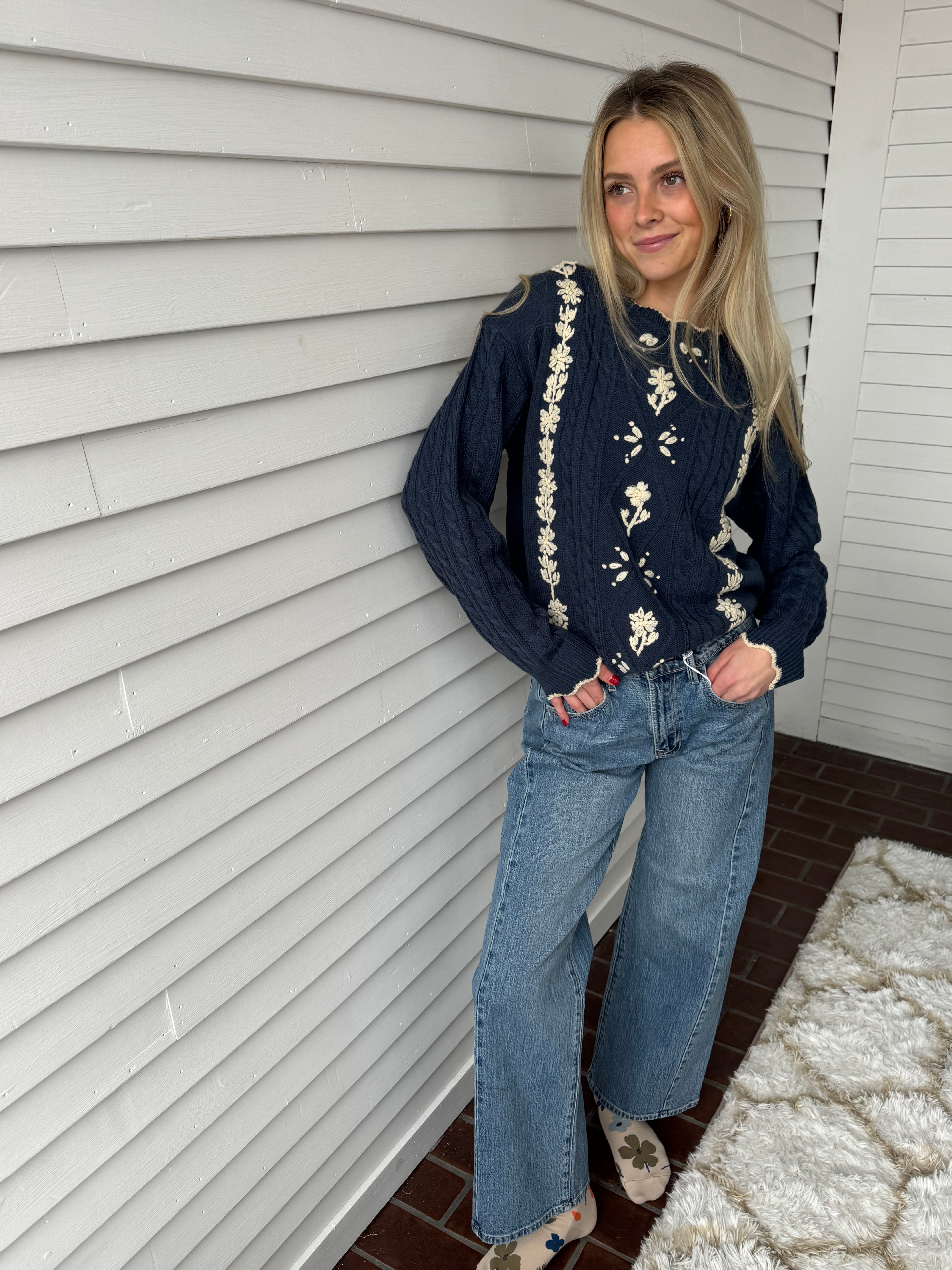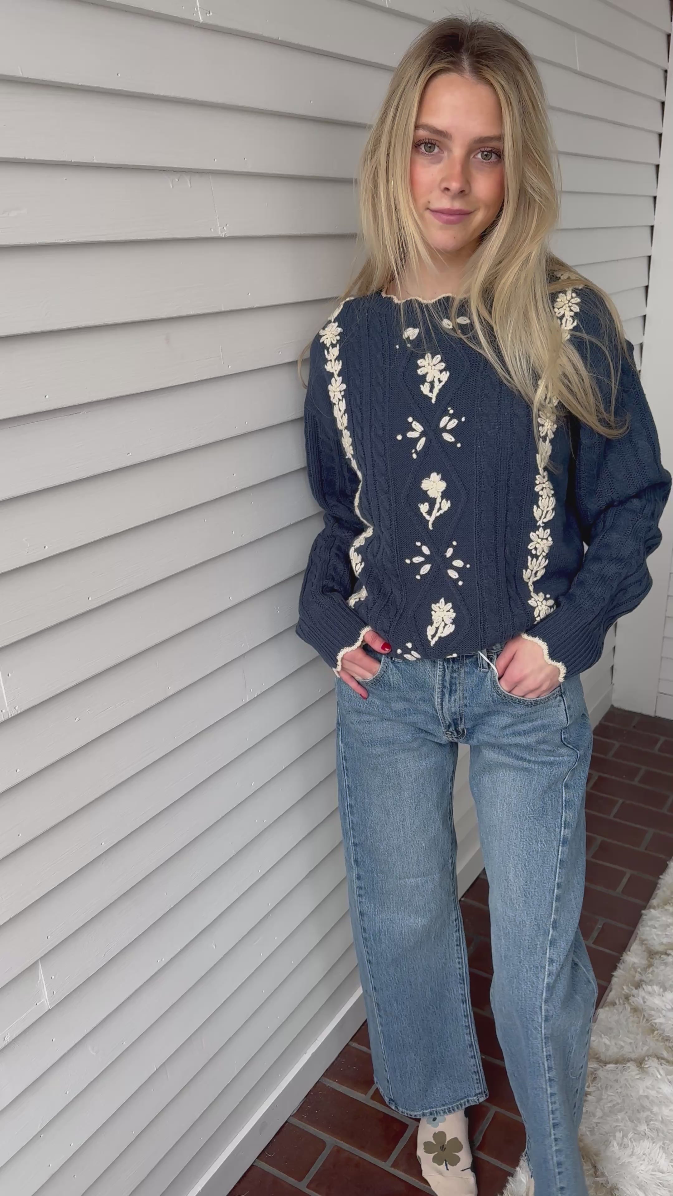 - Soft Cable Knit: Cozy, mid-weight cable knit for warmth and texture - Floral Embroidery: Cream floral embroidery down the front and sleeves adds a romantic, handcrafted touch - Relaxed Fit: Slightly loose silhouette for comfort and easy layering - Ribbed Trim: Ribbing at cuffs, hem, and neckline for structure and shape retention - Scalloped Hem Detail: Subtle scallop edge at hem adds a sweet vintage finish - Pullover Design: Easy-to-wear crew neckline for everyday styling - Model is 5' 7.5" 34-24-34 and wearing a size Small A charming knit that blends cozy cottagecore vibes with delicate floral detailing for a look that's both playful and polished.