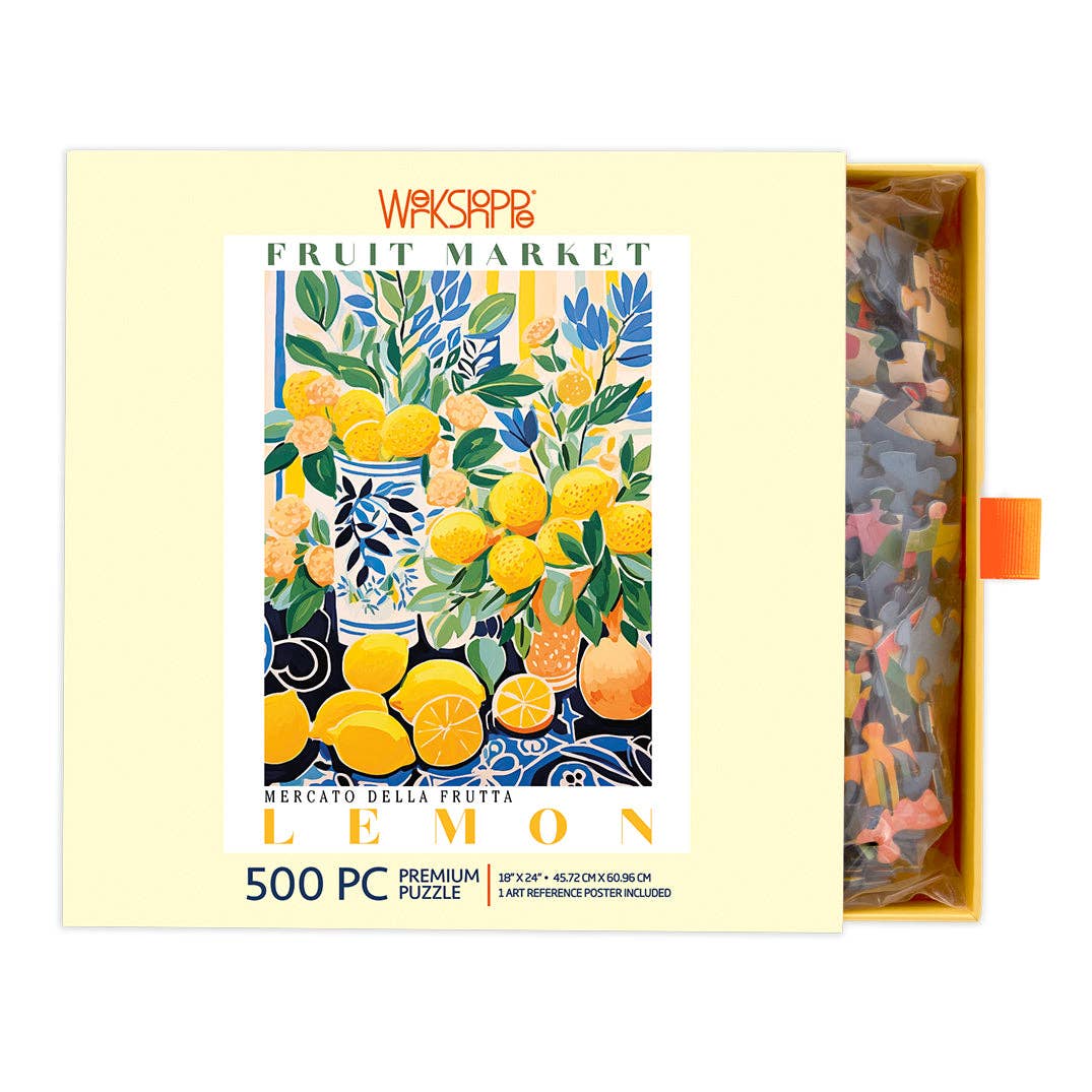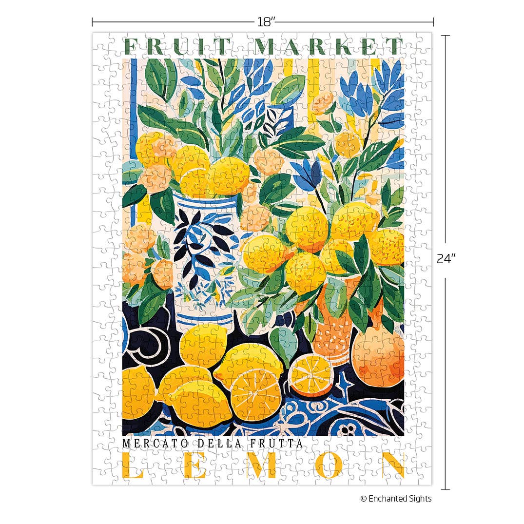 Escape into a sun-drenched Mediterranean fruit market with this captivating 500-piece puzzle! Watch as vibrant lemon branches, delicate citrus blossoms, and ornate ceramic vases come together in a burst of golden yellows, rich greens, and striking blues. Each piece reveals a slice of pure visual joy—the perfect antidote to a hectic day. Whether you're seeking a meditative afternoon activity or a mood-boosting challenge, this puzzle strikes that sweet spot between satisfying difficulty and delightful charm. Crafted with care using 100% recycled paperboard and eco-friendly vegetable-based inks, it's a puzzle that feels as good as it looks. Measures 18" x 24" when complete. A little slice of sunshine for your table.