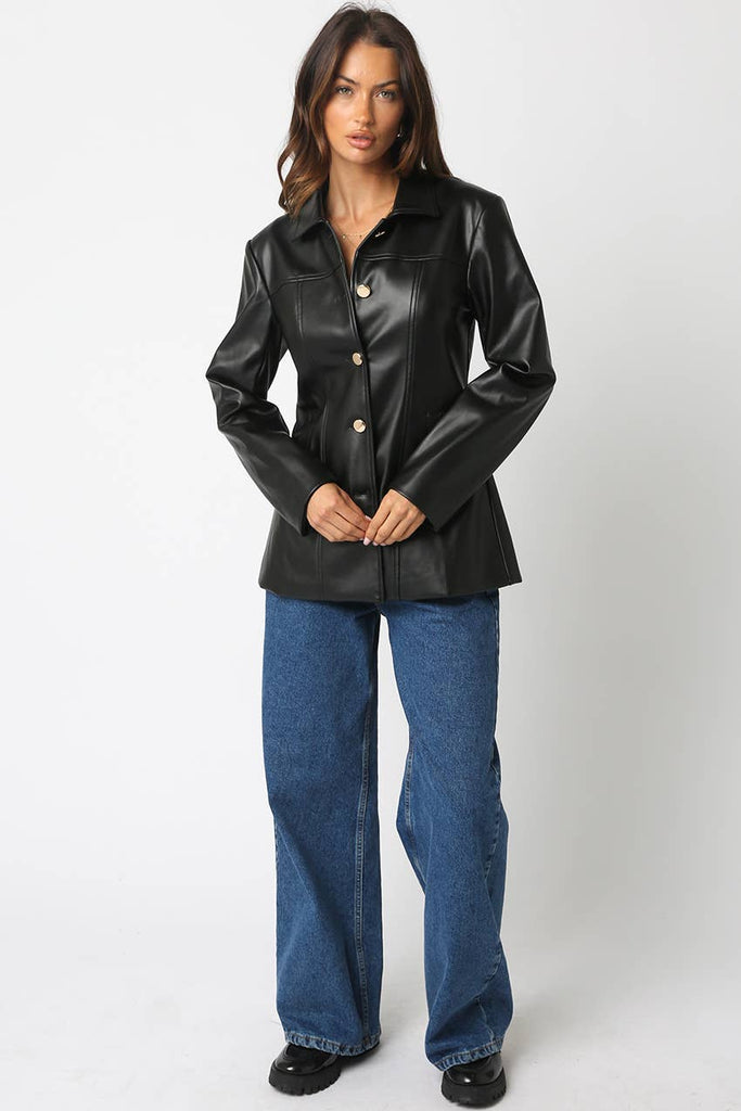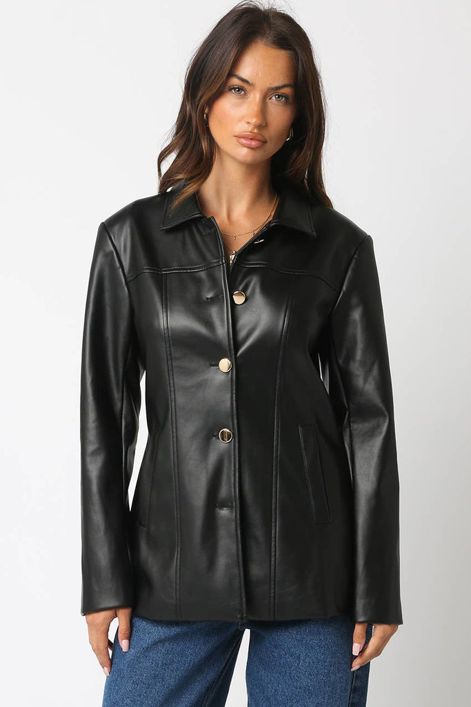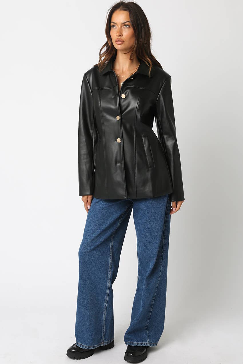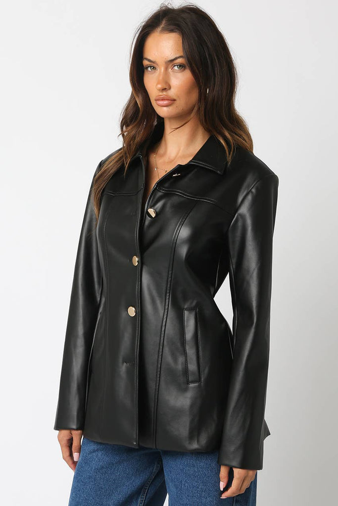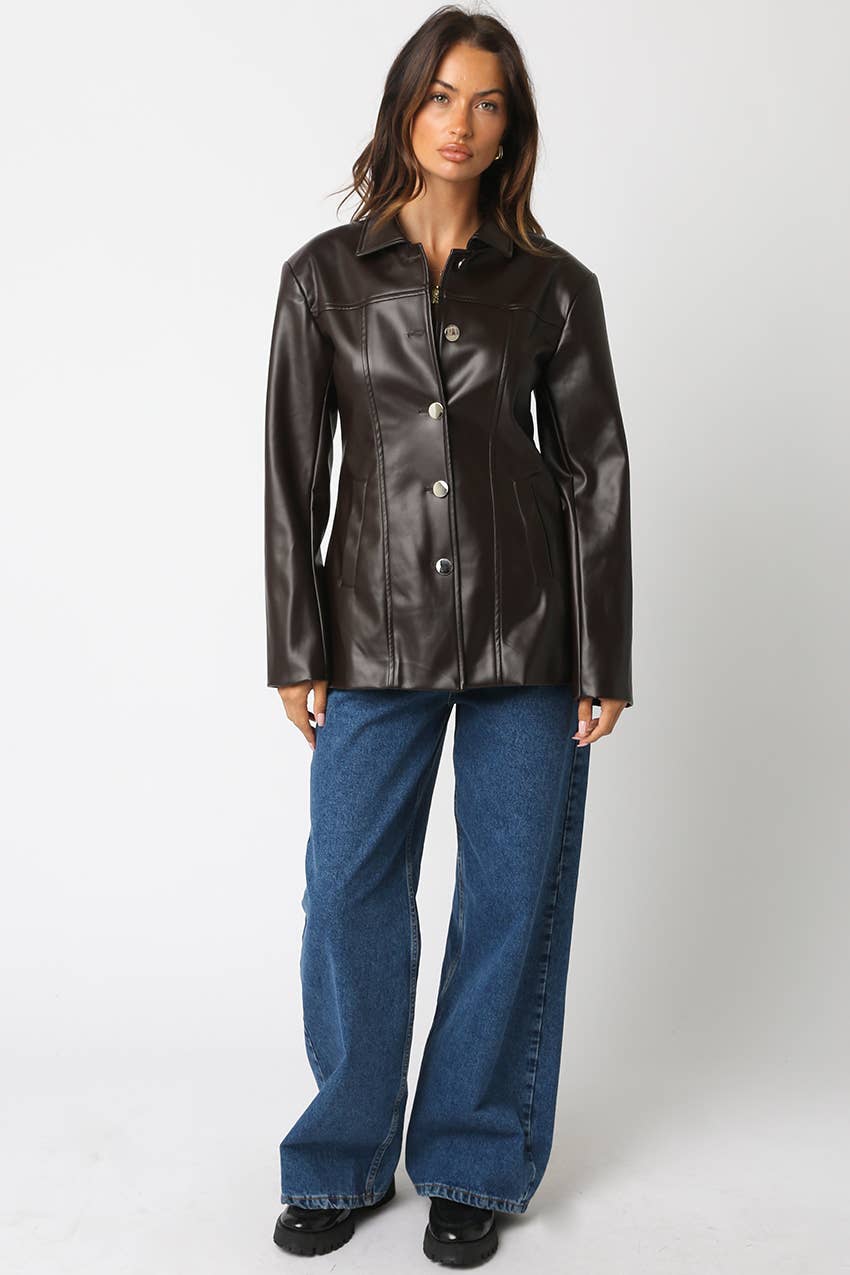 The Lucia Pu Button Jacket in Dark Chocolate combines timeless elegance with contemporary silhouette. This woven piece features a classic button-down front and refined slim waistline that flatters the figure. The rich chocolate tone offers versatile styling for both professional and casual occasions, making it an essential layering piece for any wardrobe. Perfect for elevating everyday looks with understated sophistication.