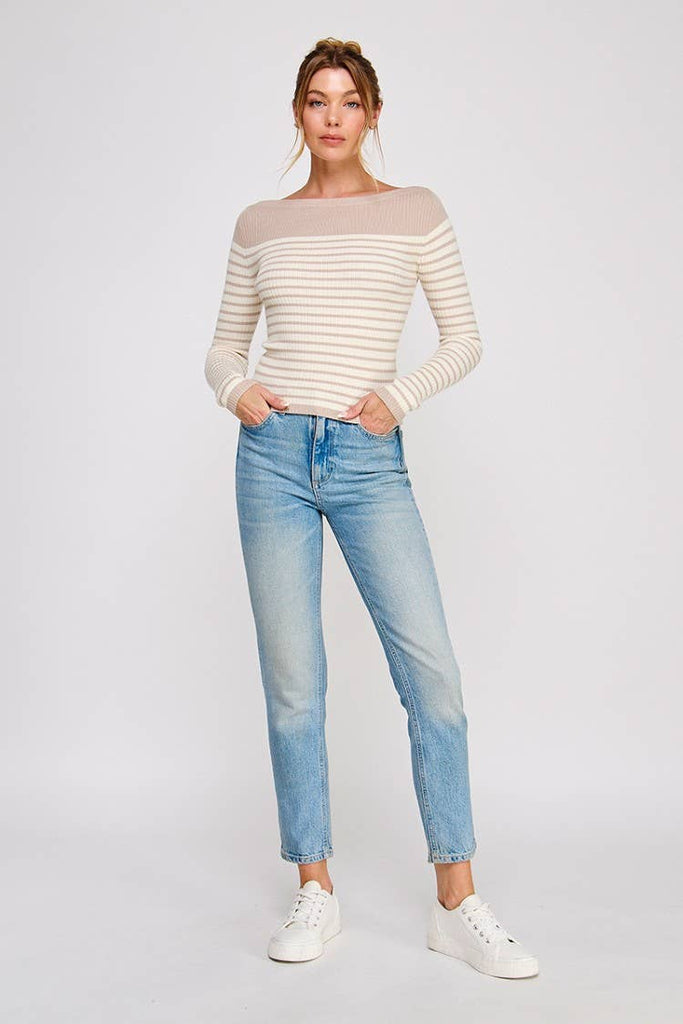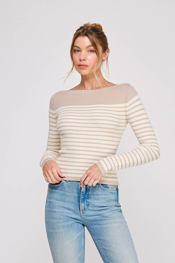 This elegant long sleeve features a soft rib knit texture with a refined boat neck design, blending cream and mocha stripes for a subtle yet chic look. Crafted from a comfortable poly blend, it offers a polished silhouette perfect for layering or wearing alone in cooler weather. The understated color palette pairs effortlessly with both casual and dressier outfits.