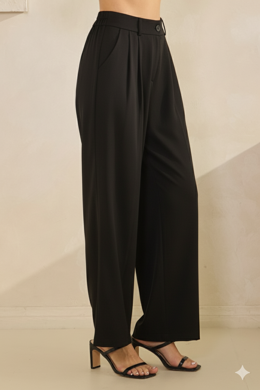 Sophisticated high-waisted wide-leg trousers offer both comfort and elegance. They feature a flattering pleated front, a classic button and zip closure, and a relaxed fit through the leg, making them a versatile choice for a stylish look.
