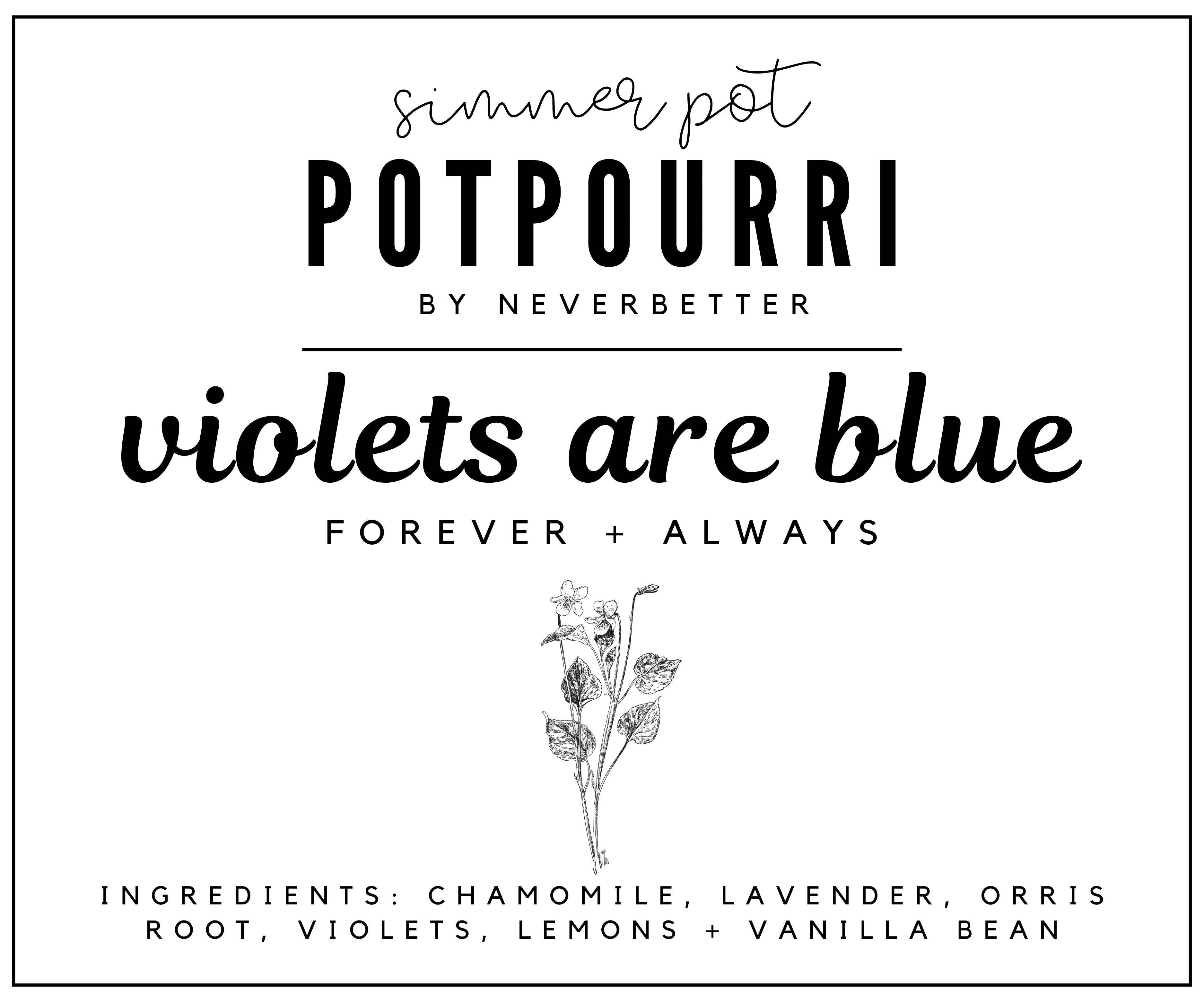 Infuse your space with Violets are Blue Simmer Pot Potpourri. Forever + Always. Made with all natural, high quality ingredients. Simply pour contents into a saucepan and add water to cover ingredients. Top off with water periodically. Your home will smell glorious!!